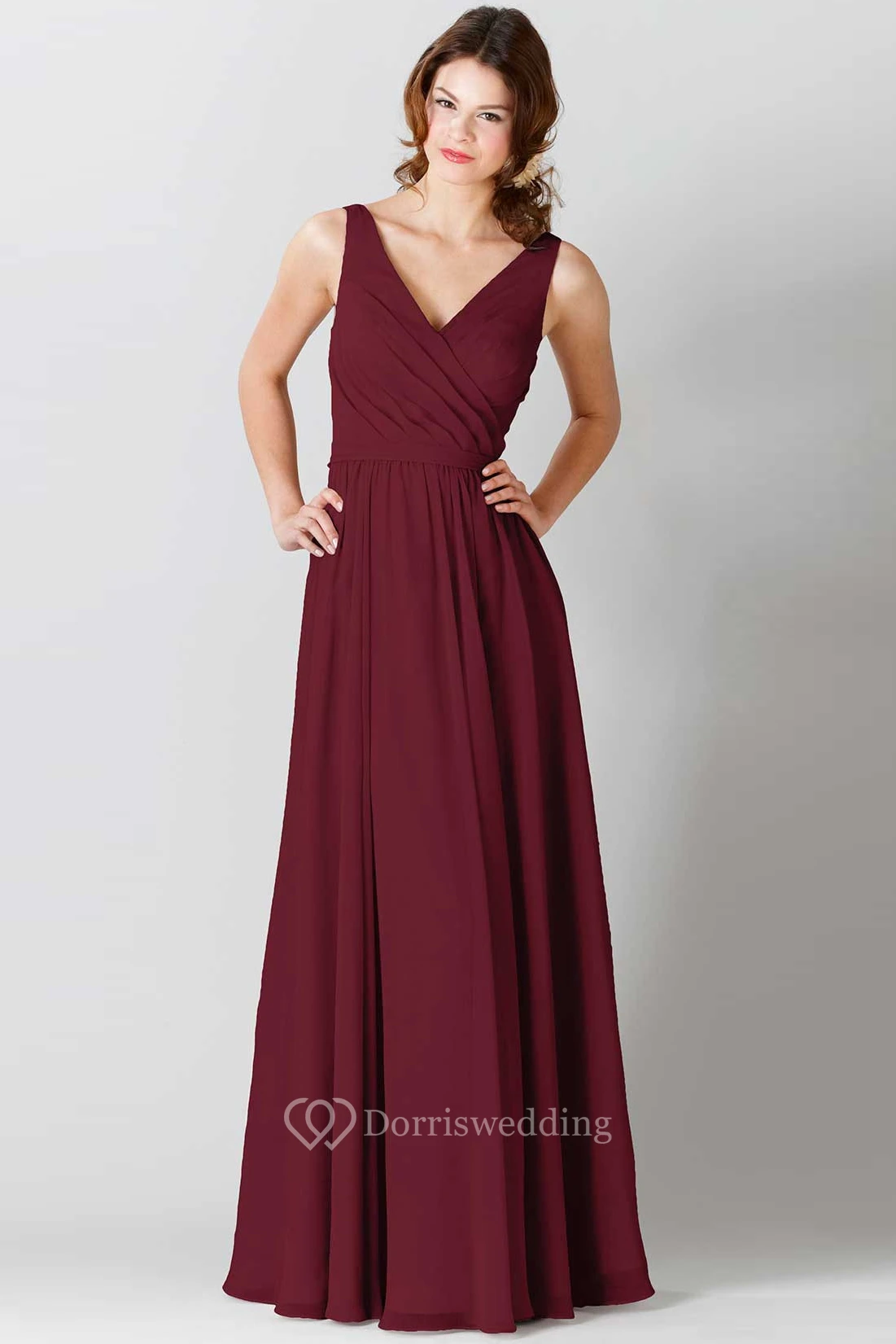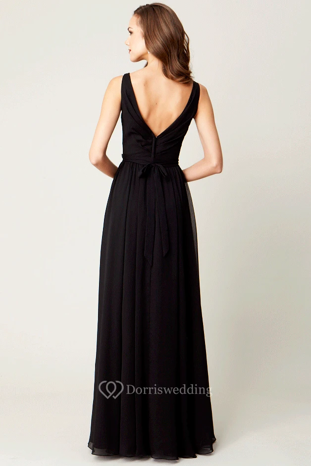 Maxi Sleeveless Ruched V-Neck Chiffon Bridesmaid Dress With Bow
