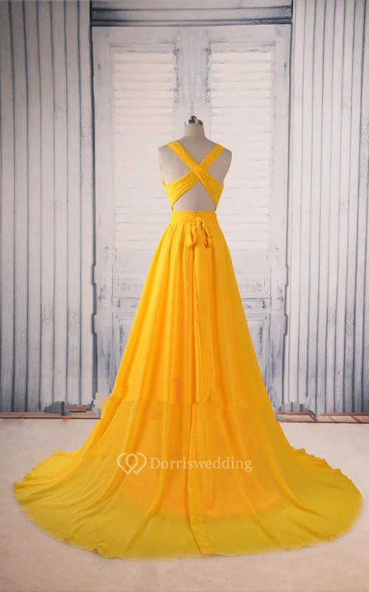 Maxi V-neck A-line Keyhole Chiffon Dress with Pleats