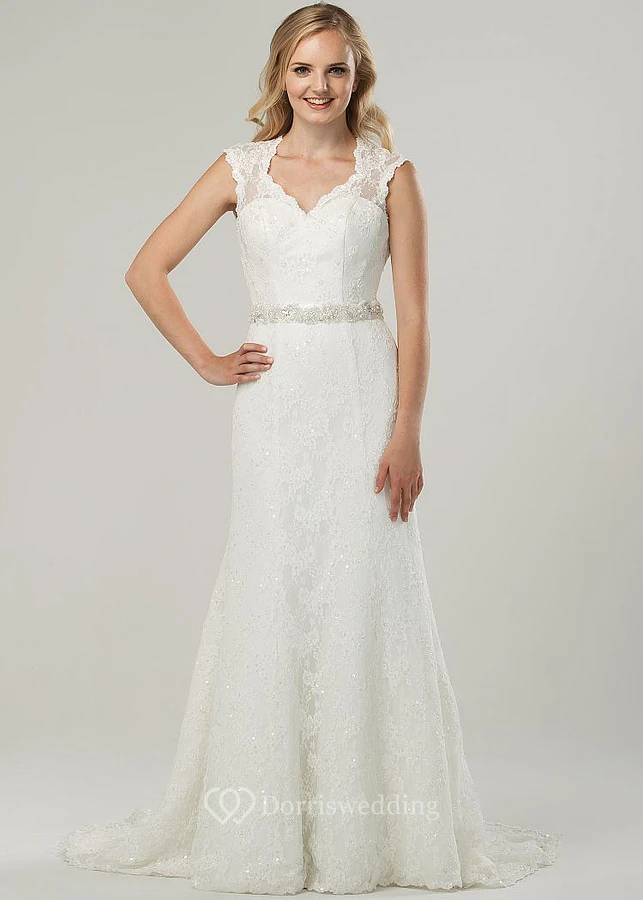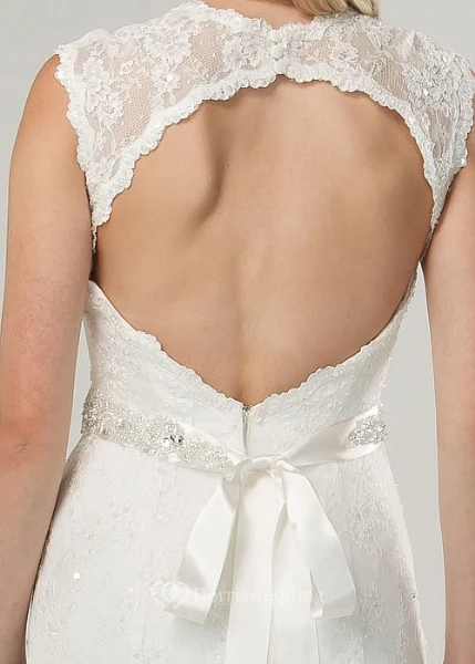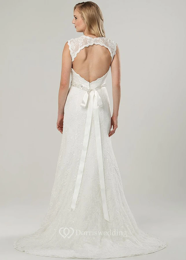 Maxi V-Neck Beaded Bowed Lace Wedding Dress With Sweep Train And Keyhole
