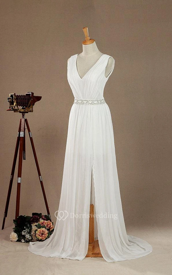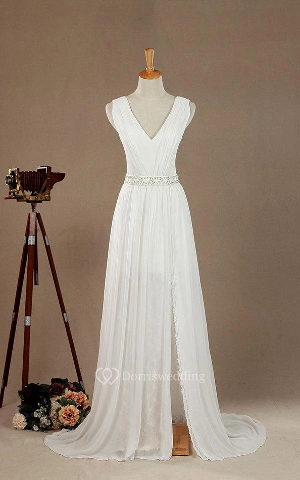Maxi V-Neck Chiffon Lace Satin Weddig Vow Renewal Dress With Low-V Back