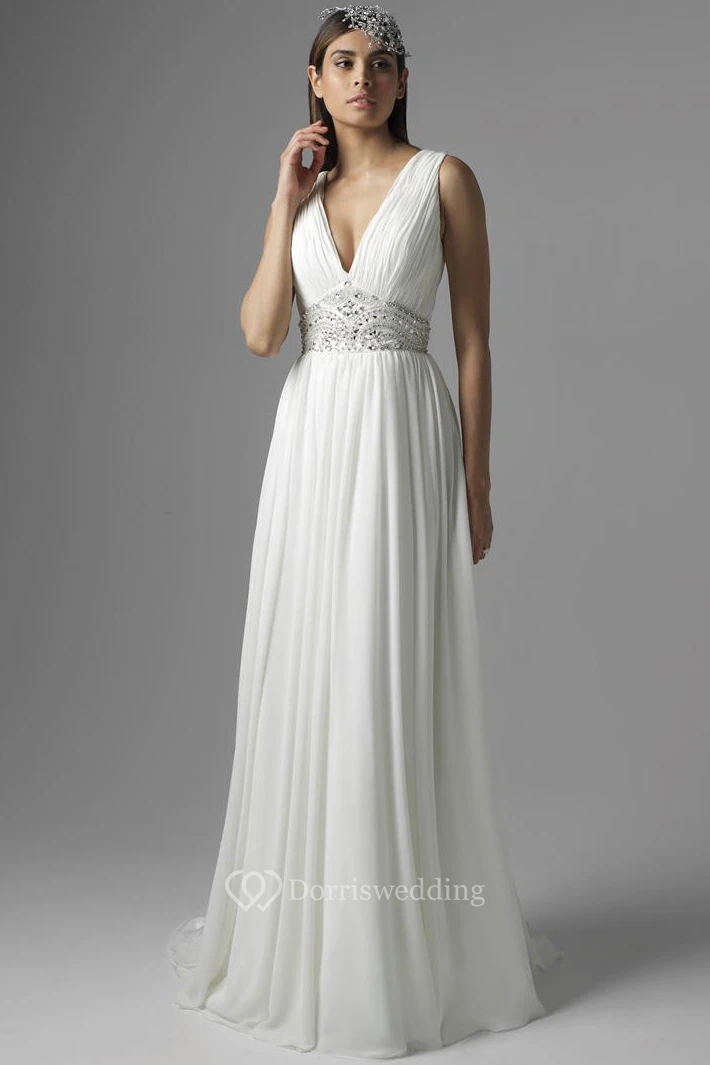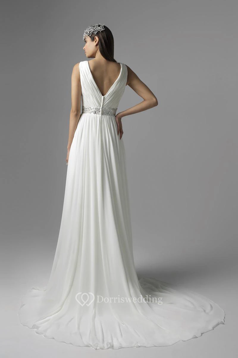 Maxi V-Neck Pleated Chiffon Wedding Dress With Sweep Train And V Back