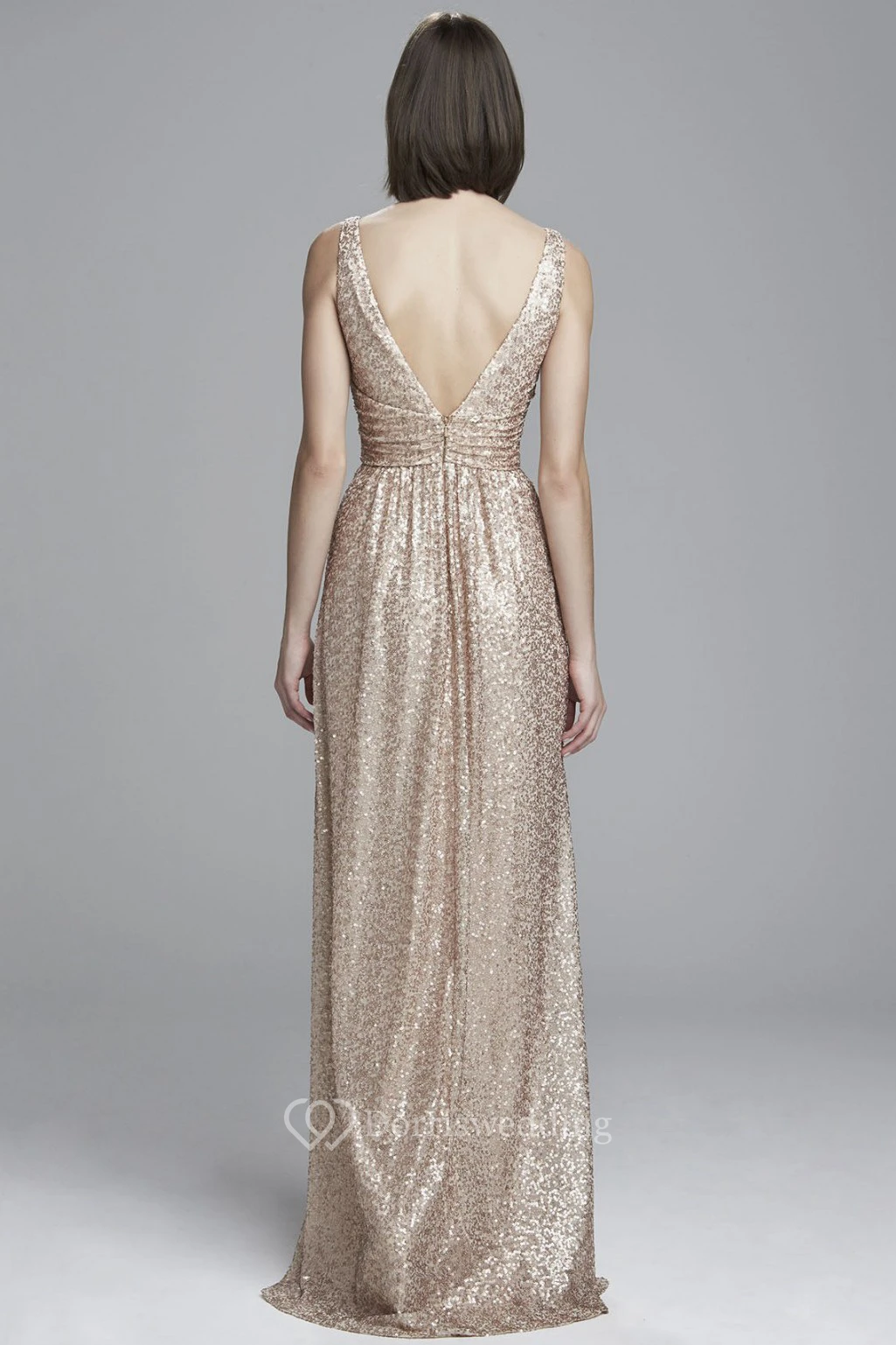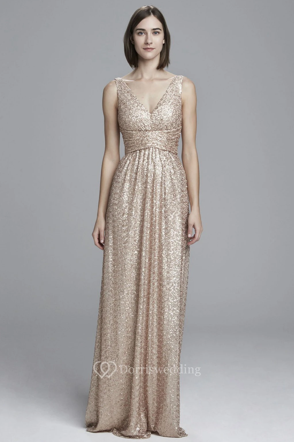 Maxi V-Neck Sleeveless Ruched Sequin Bridesmaid Dress