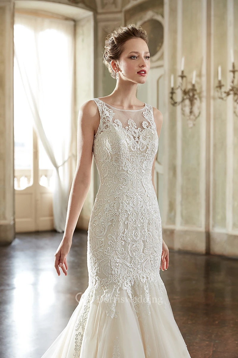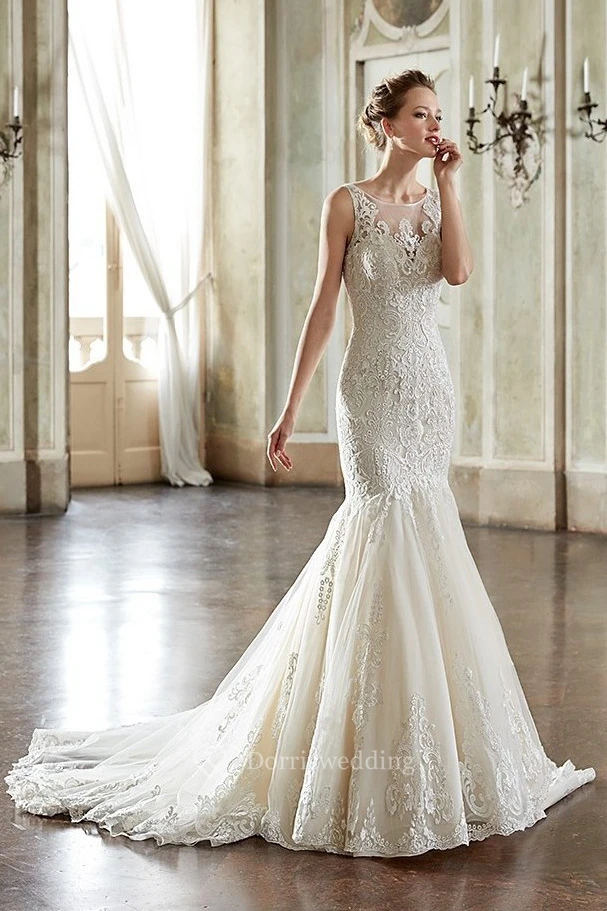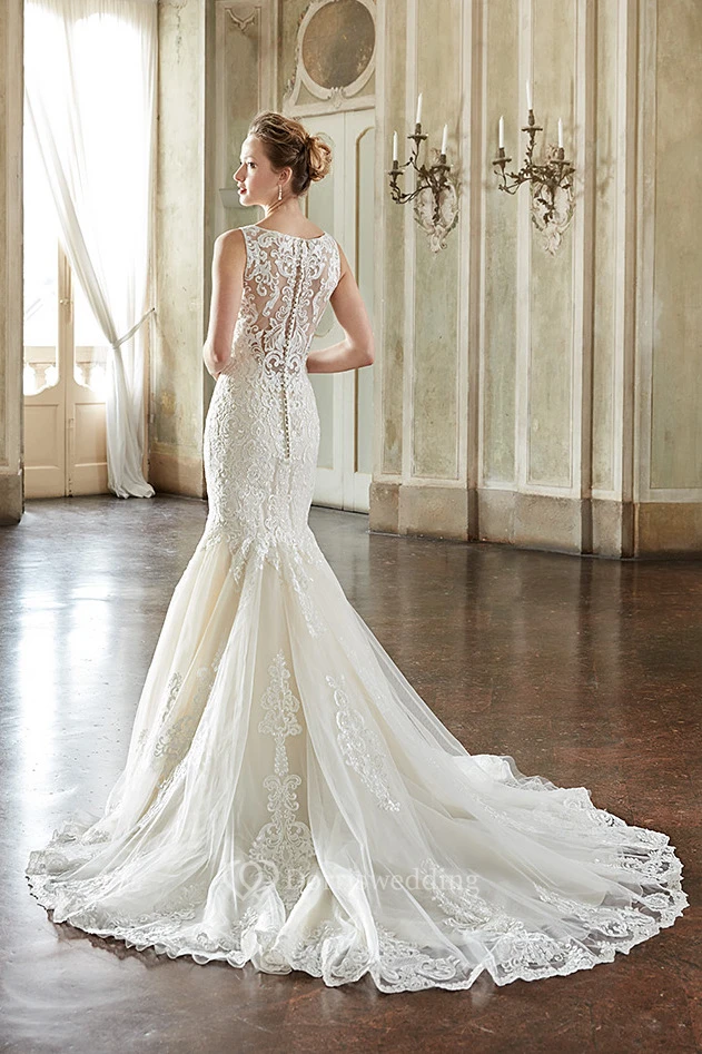 Mermaid Appliqued Floor-Length Scoop-Neck Sleeveless Lace Wedding Dress