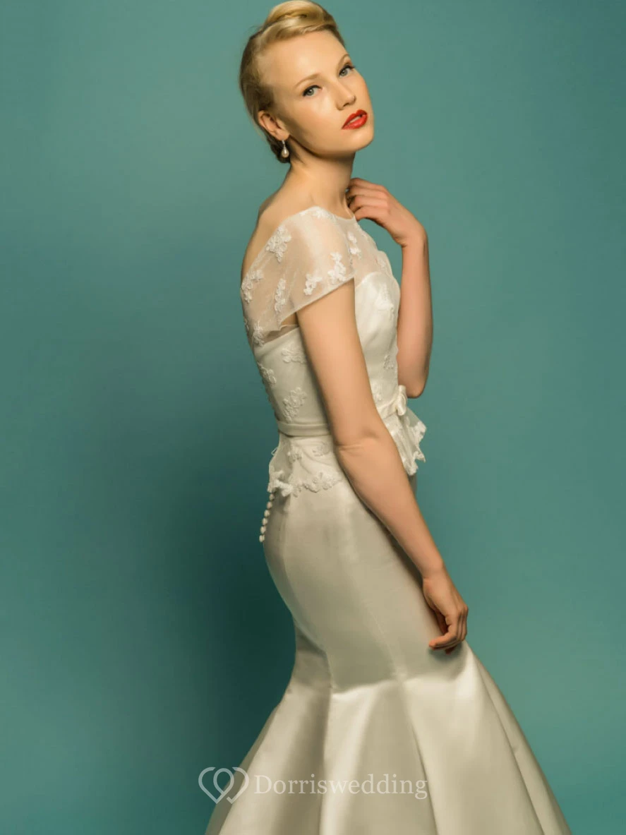 Mermaid Appliqued Short-Sleeve Scoop-Neck Maxi Satin Wedding Dress With Peplum