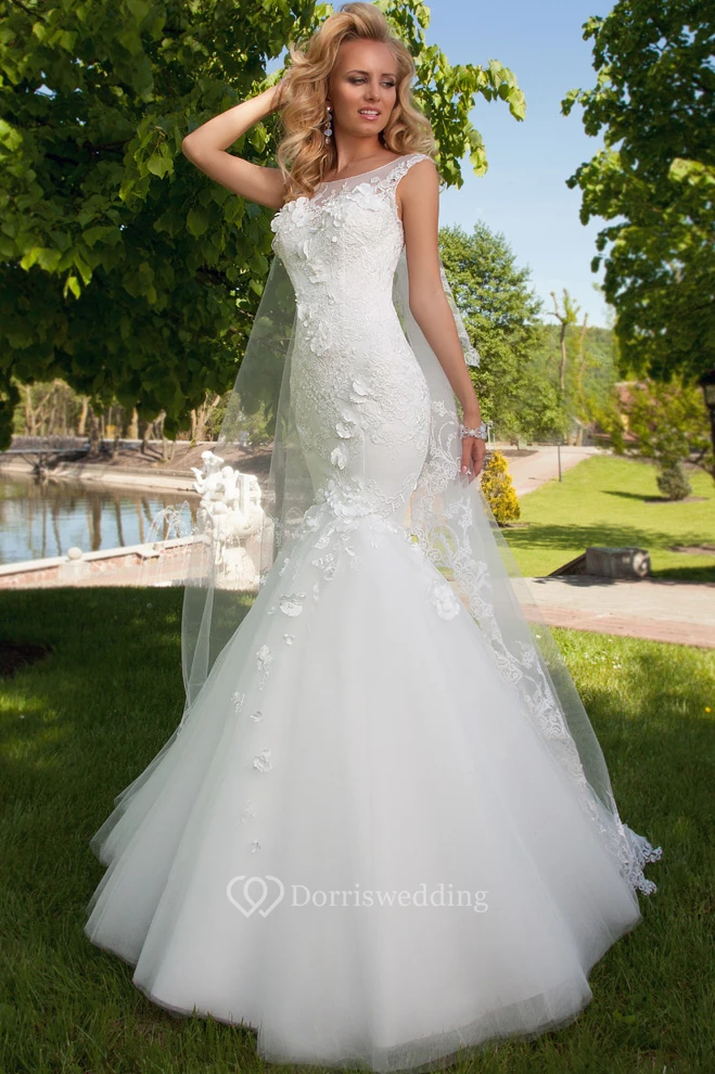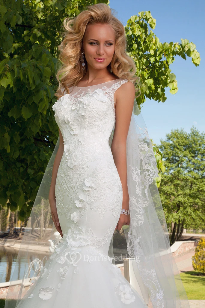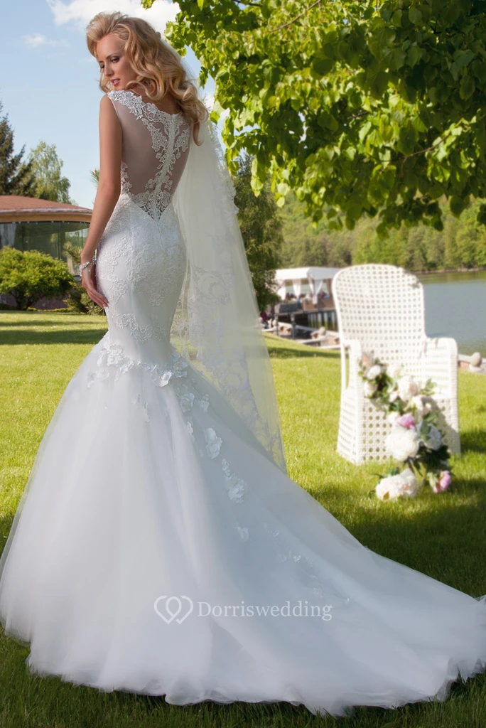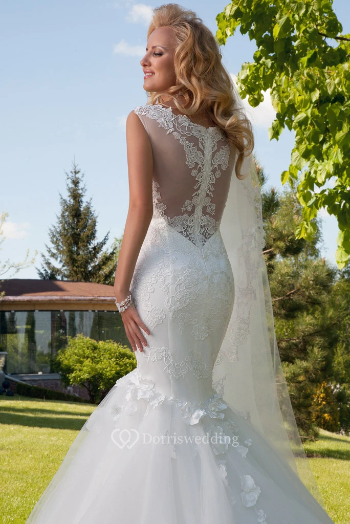Mermaid Appliqued Sleeveless Floor-Length Bateau Lace&Tulle Wedding Dress With Illusion Back And Flower
