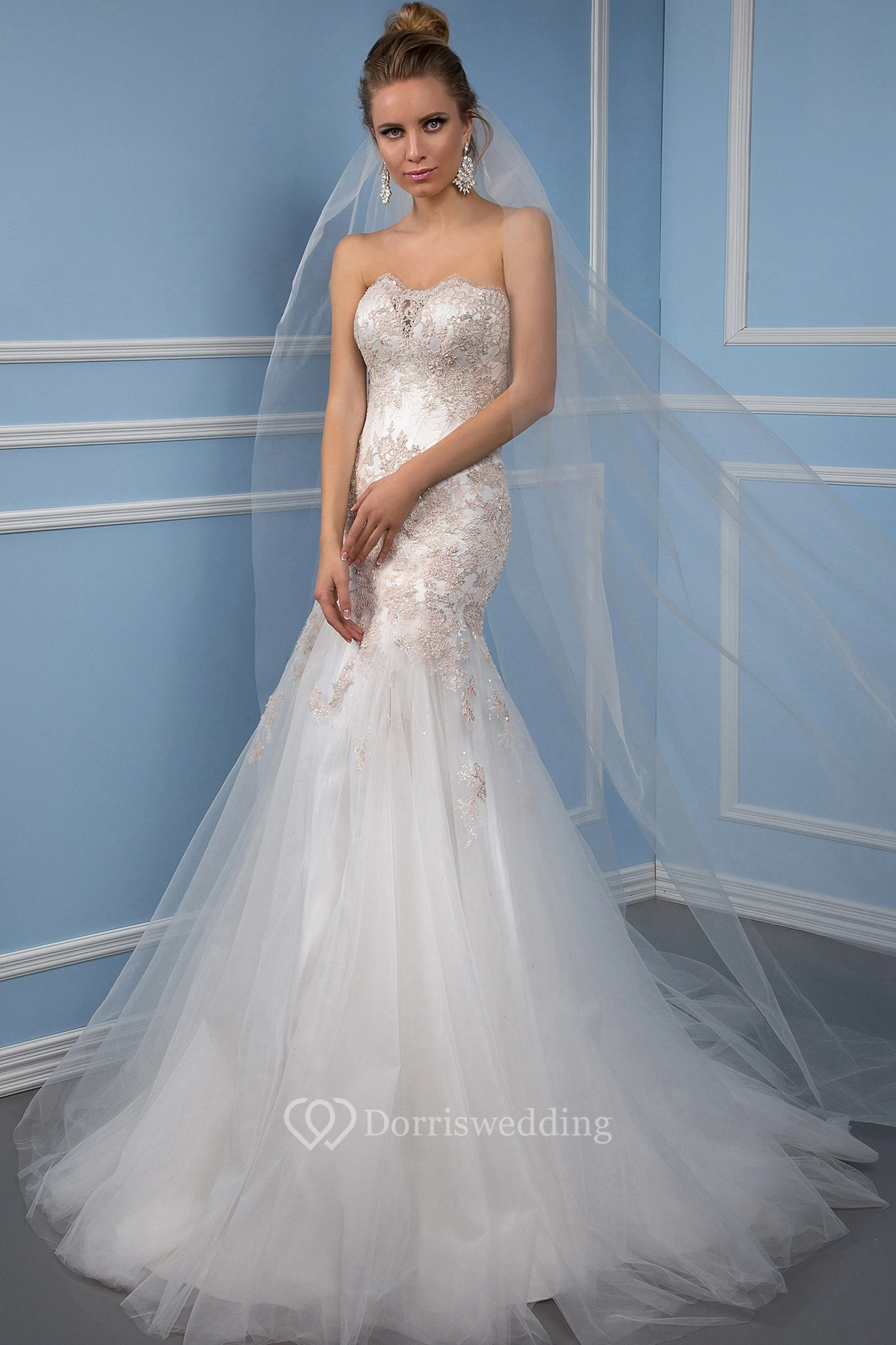 Mermaid Appliqued Sleeveless Floor-Length Strapless Tulle Wedding Dress With Lace-Up Back And Ruffles