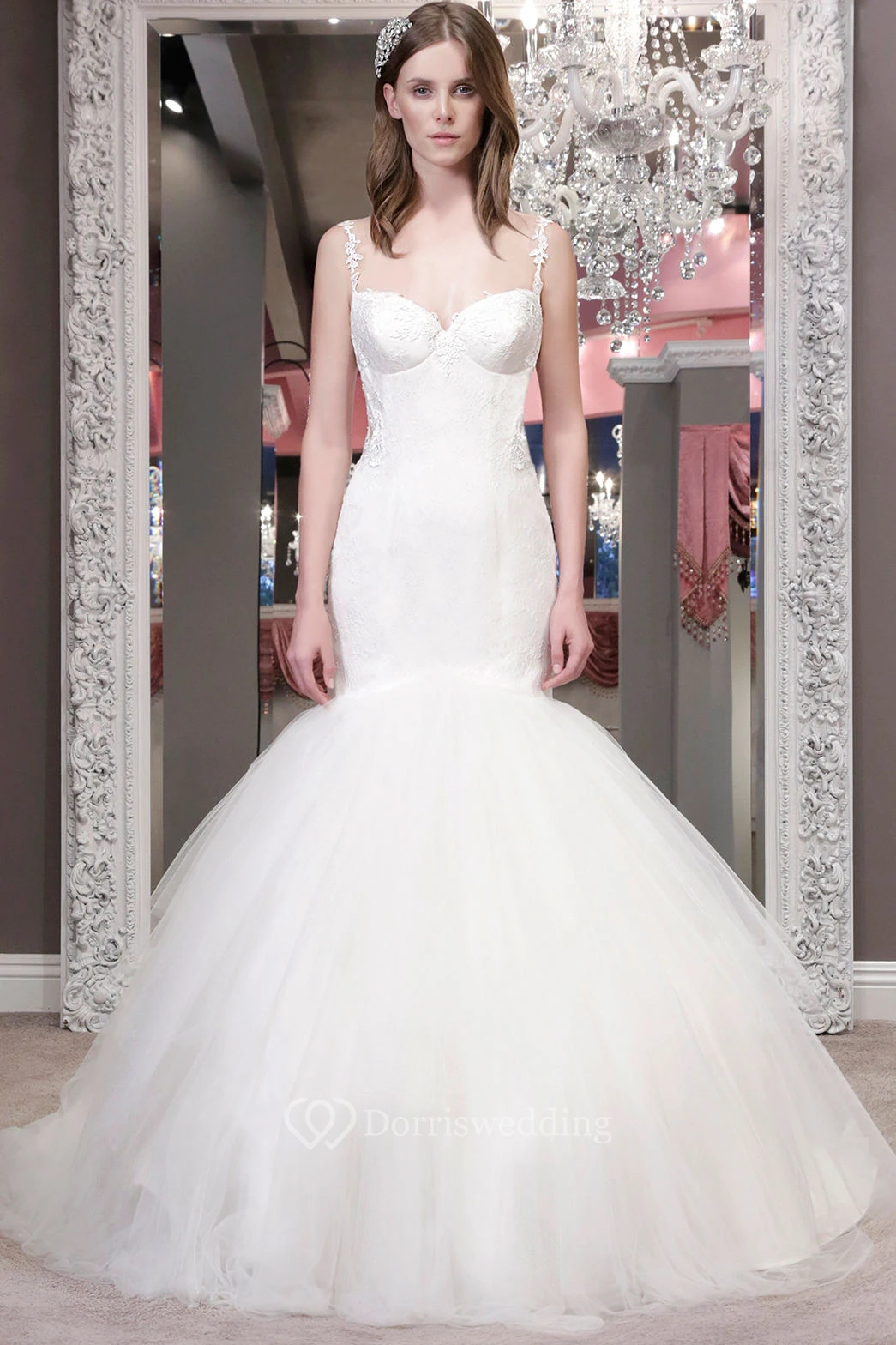 Mermaid Appliqued Spaghetti Floor-Length Sleeveless Tulle Wedding Dress With Backless Style And Ruffles