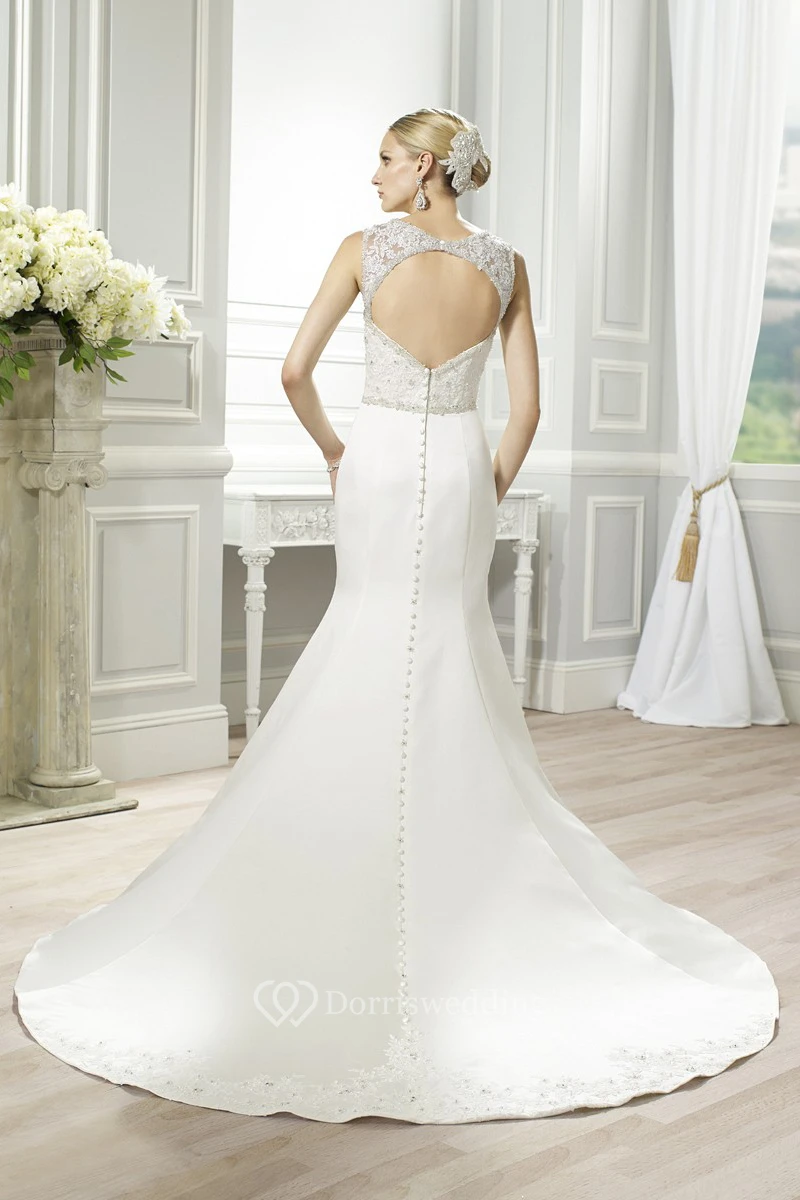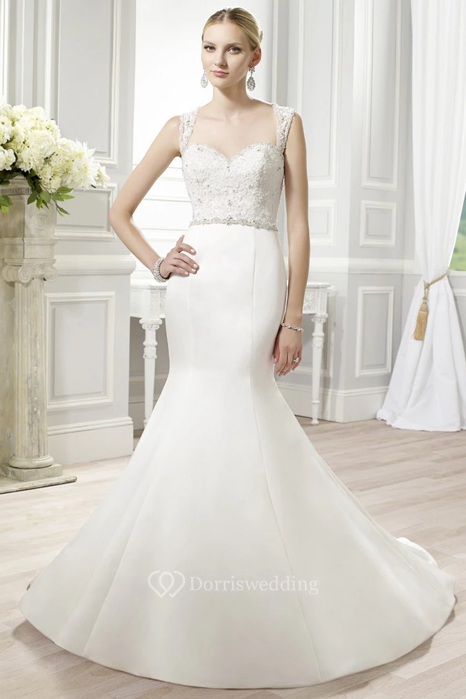 Mermaid Appliqued Straps Maxi Sleeveless Satin Wedding Dress With Waist Jewellery And Keyhole Back