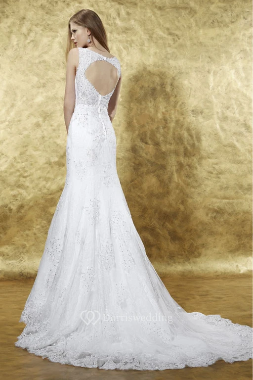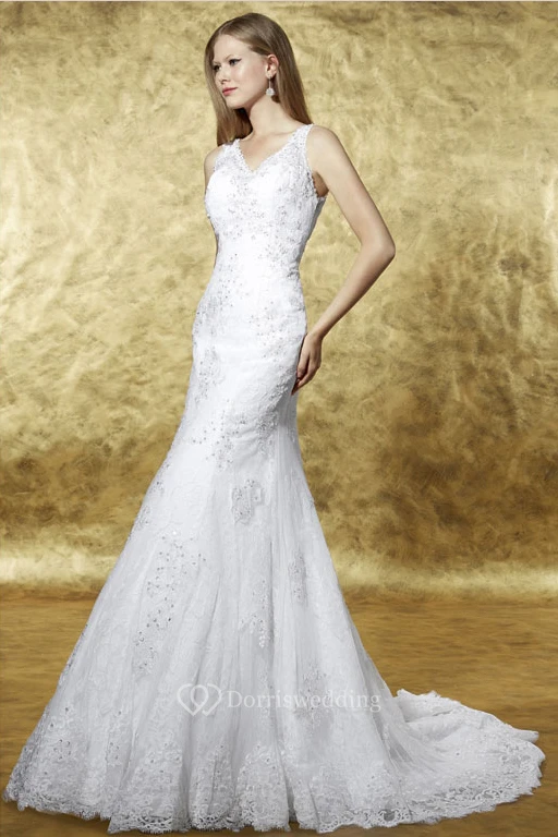 Mermaid Appliqued V-Neck Floor-Length Sleeveless Lace Wedding Dress With Keyhole Back And Beading