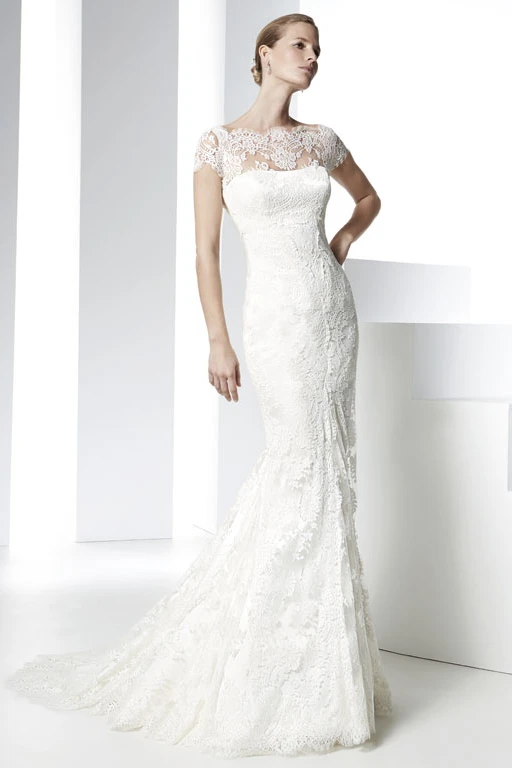 Mermaid Bateau Neck Cap Sleeve Appliqued Lace Wedding Dress With Court Train
