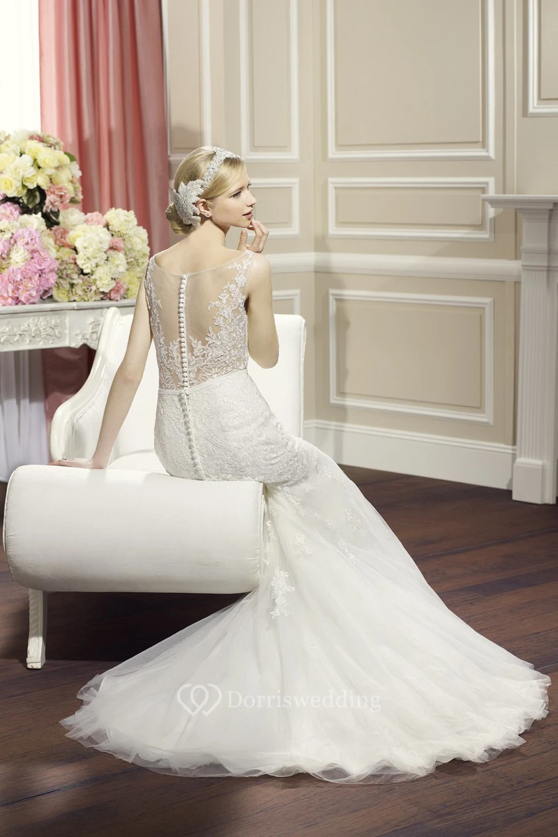 Mermaid Bateau Sleeveless Floor-Length Appliqued Lace&Satin Wedding Dress With Court Train And Illusion Back