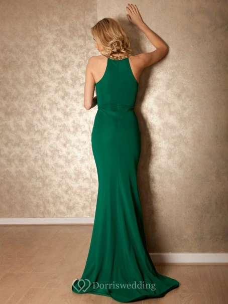 Mermaid Beaded High Neck Sleeveless Jersey Prom Dress With Brush Train