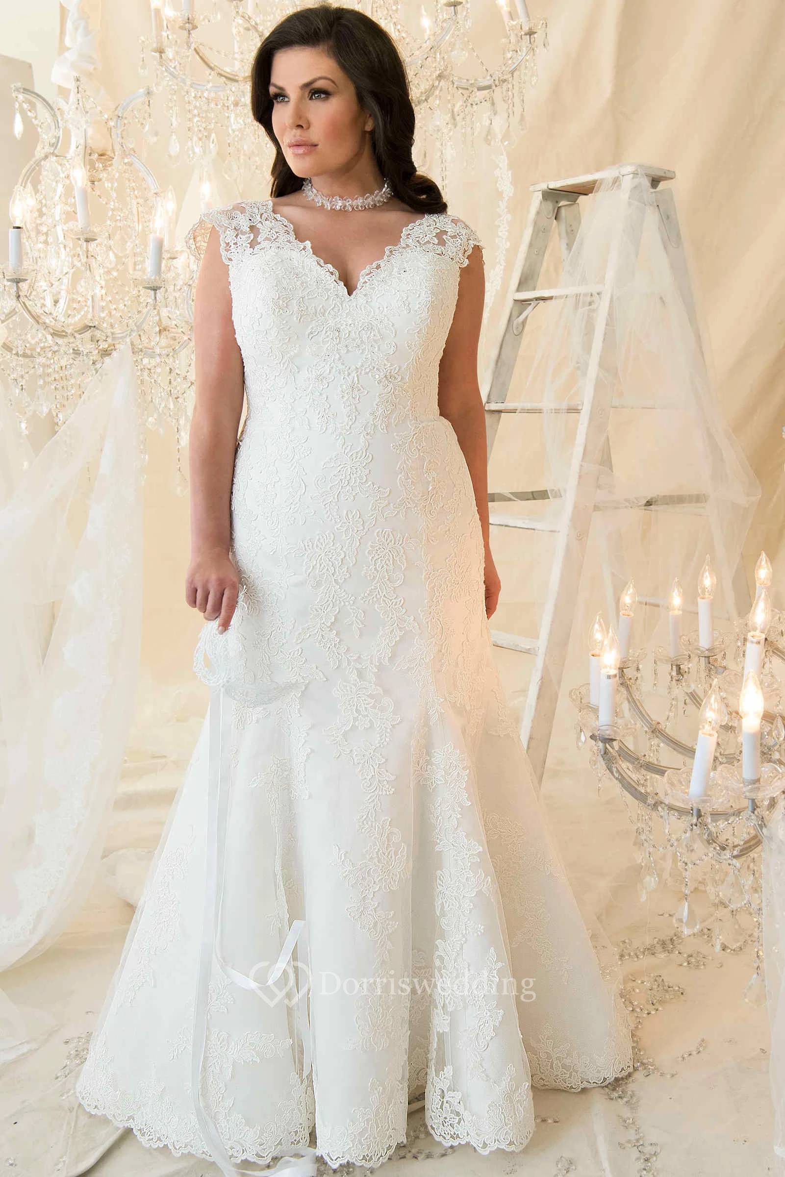 Mermaid Cap-Sleeve V-Neck Lace Plus Size Wedding Dress With Lace Up