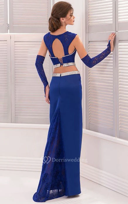 Mermaid Court Train High-Neck Short Sleeve Lace Crystal Detailing Pleats Keyhole Dress