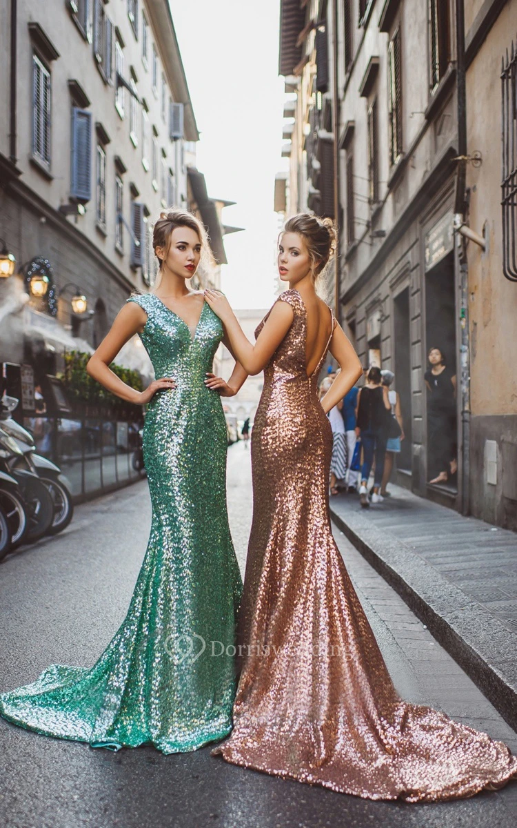 Mermaid Court Train V-Neck Short Sleeve Sequins Pleats Low-V Back Dress