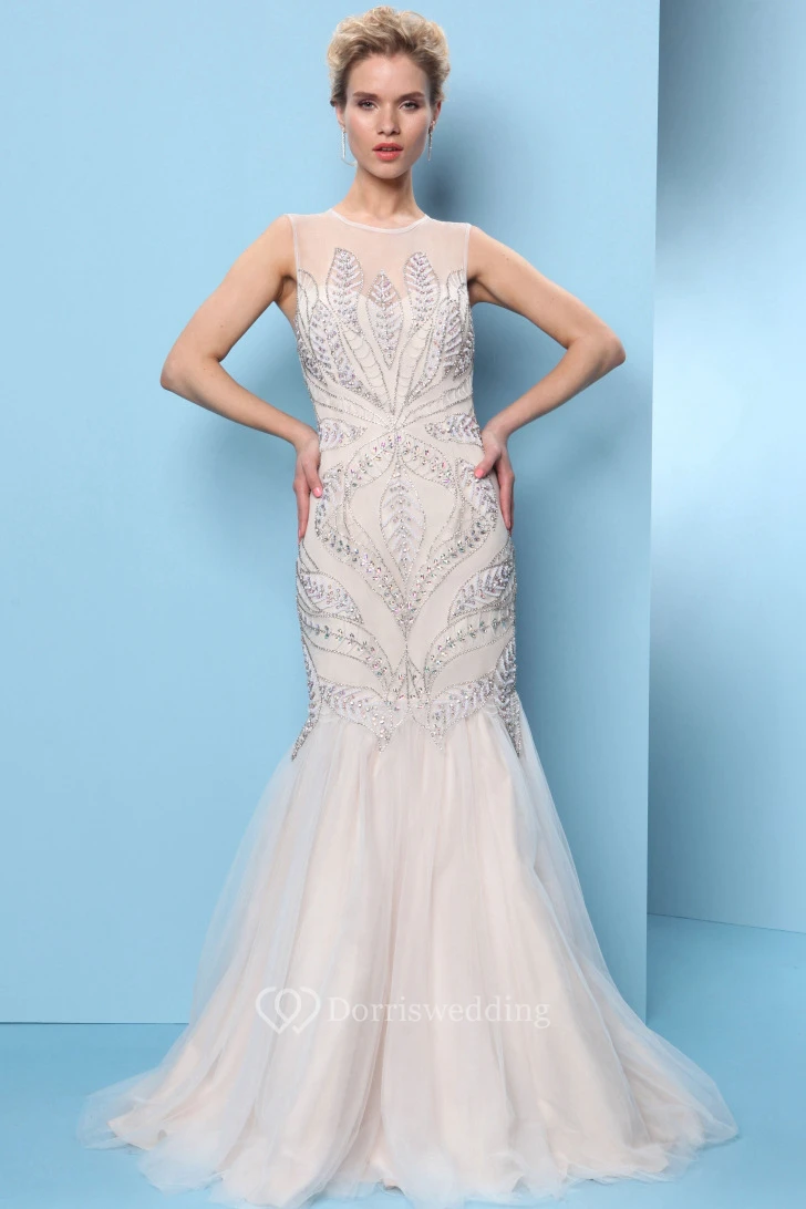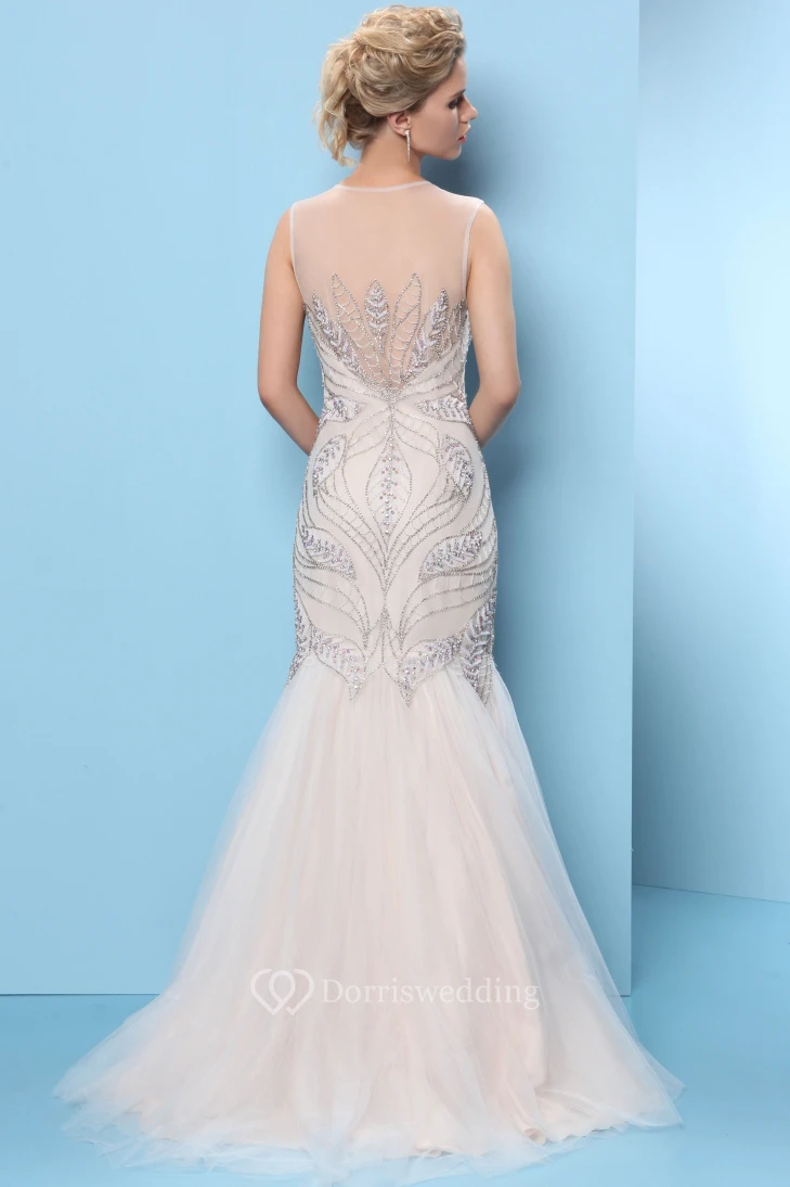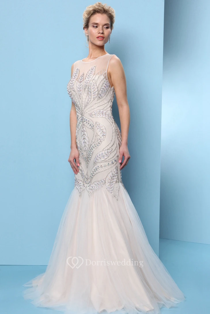Mermaid Crystal Sleeveless Jewel-Neck Floor-Length Tulle Prom Dress With Pleats