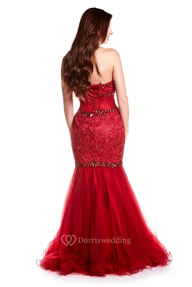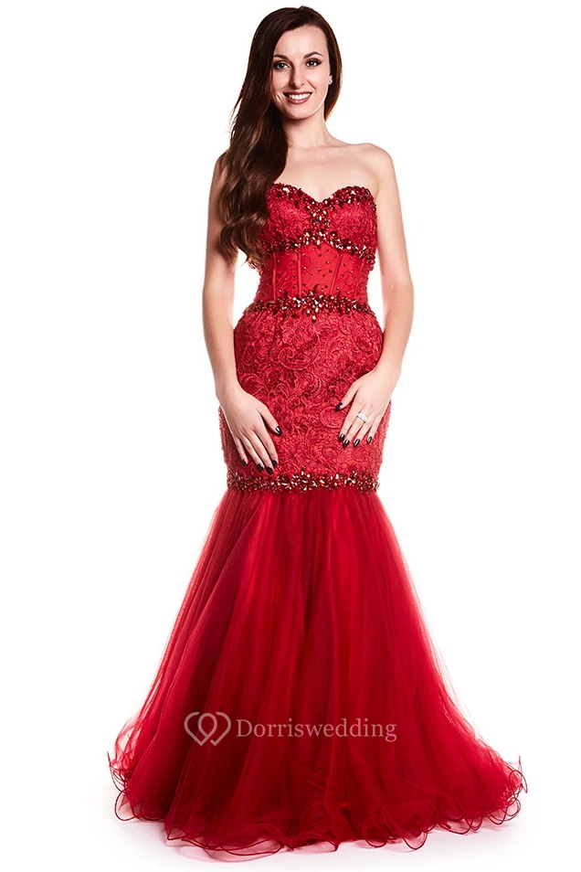 Mermaid Crystal Sweetheart Sleeveless Floor-Length Tulle&Lace Prom Dress With Backless Style And Appliques