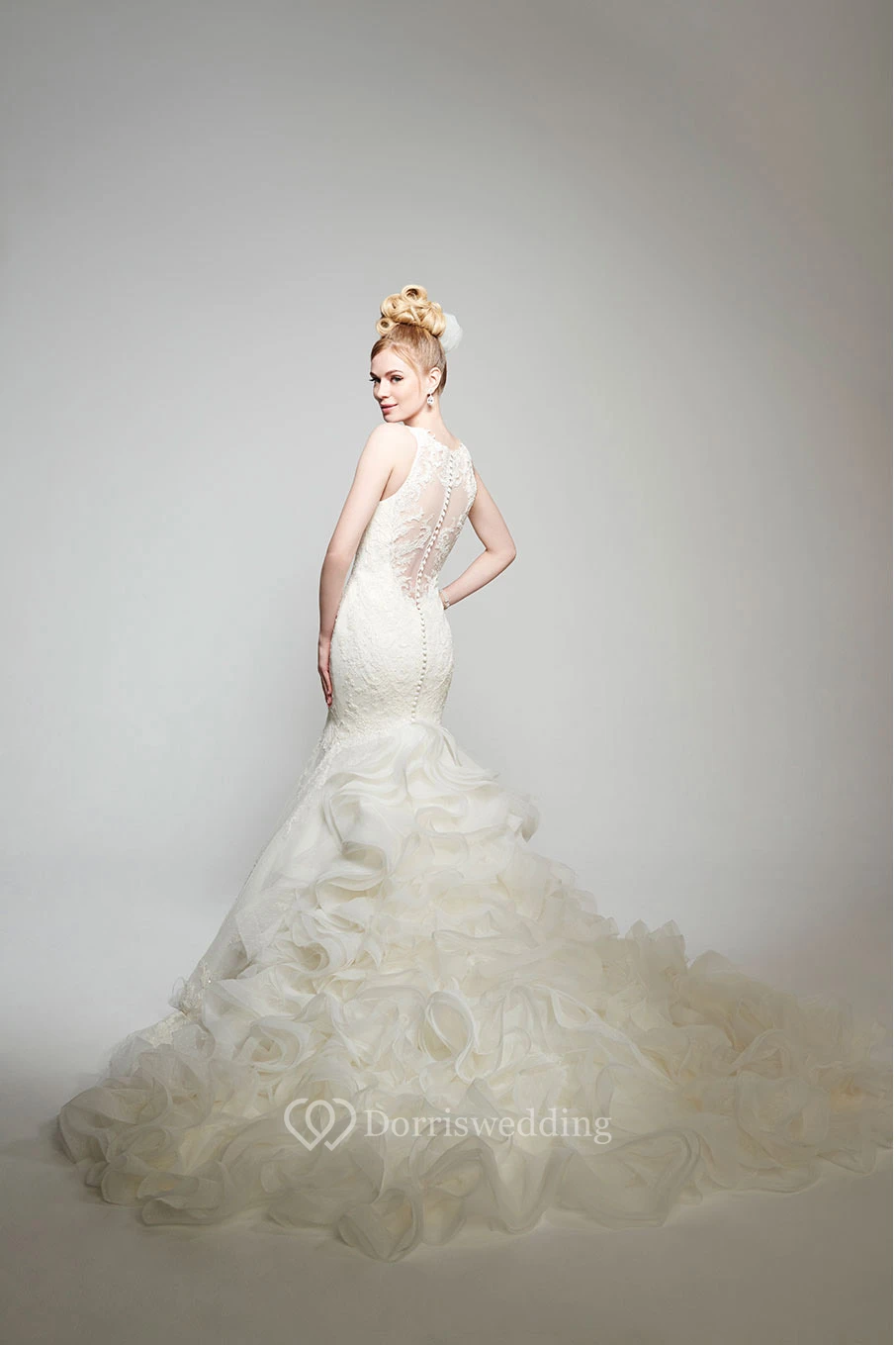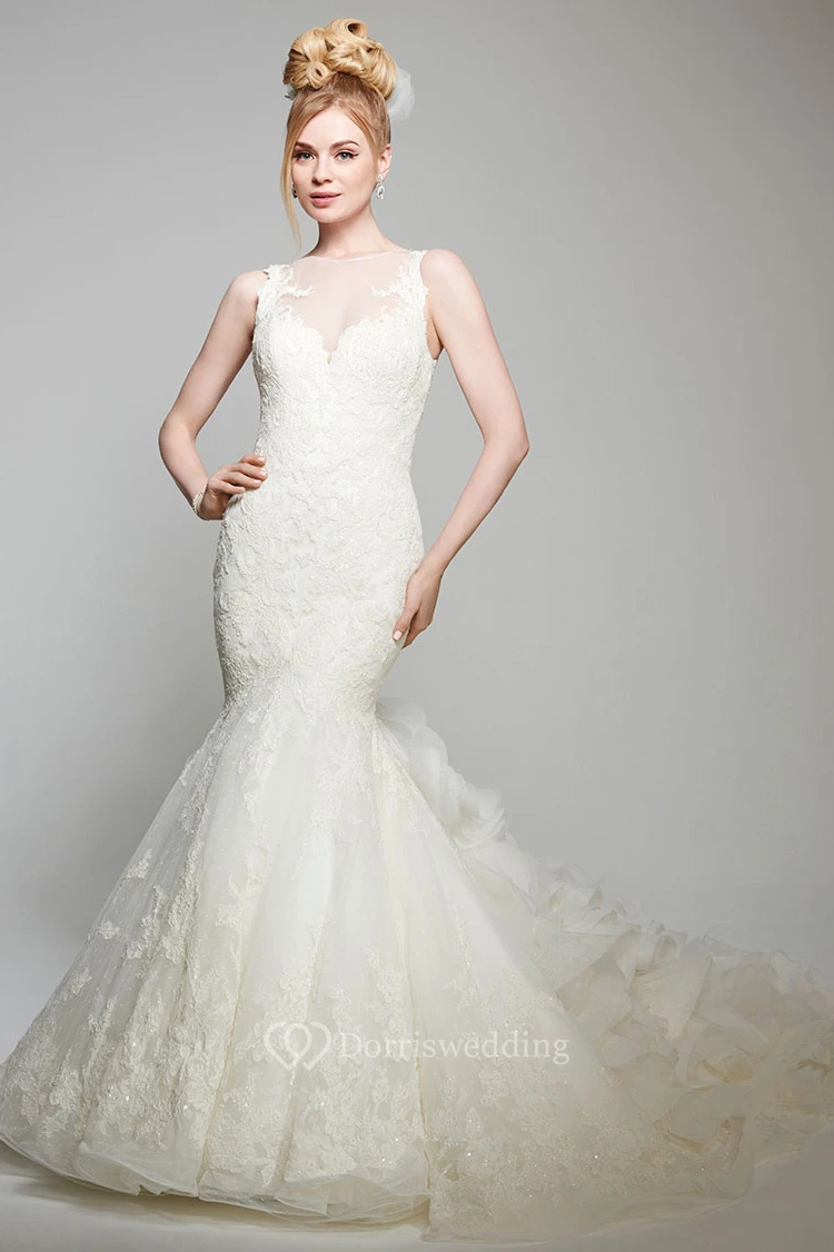 Mermaid Floor-Length Appliqued Sleeveless Jewel Lace Wedding Dress With Ruffles And Illusion Back