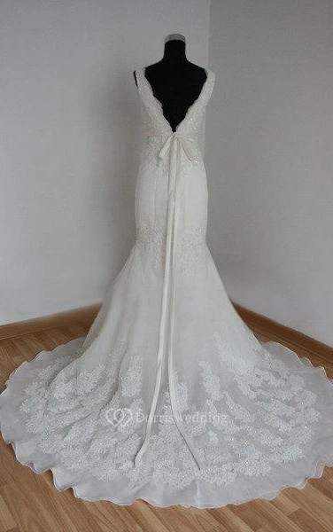 Mermaid Floor-Length Cap Beading Appliques Keyhole Lace Satin Dress