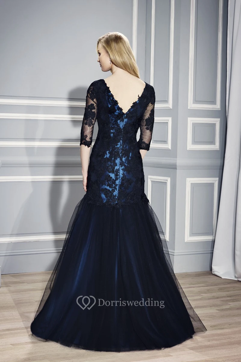 Mermaid Floor-Length Half Sleeve Appliqued V-Neck Satin Formal Dress