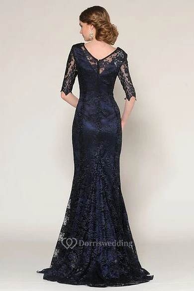 Mermaid Floor-Length Half-Sleeve Scoop-Neck Appliqued Lace Prom Dress