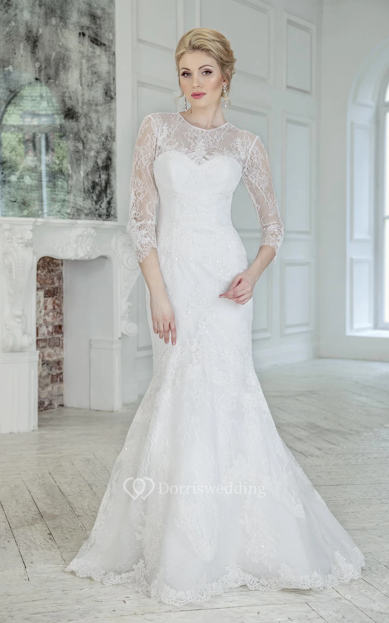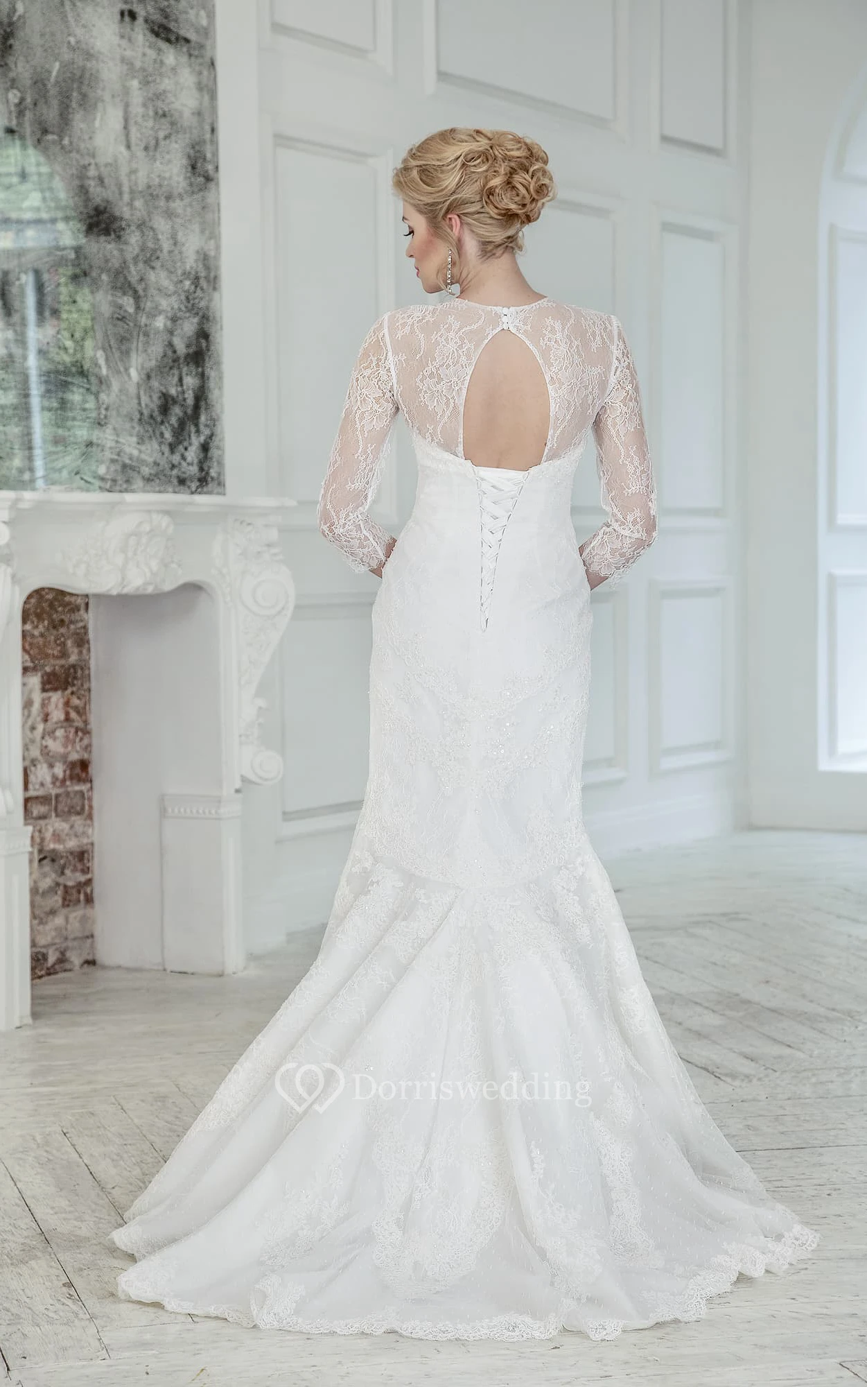 Mermaid Floor-Length Jewel 3-4-Sleeve Keyhole Lace Dress