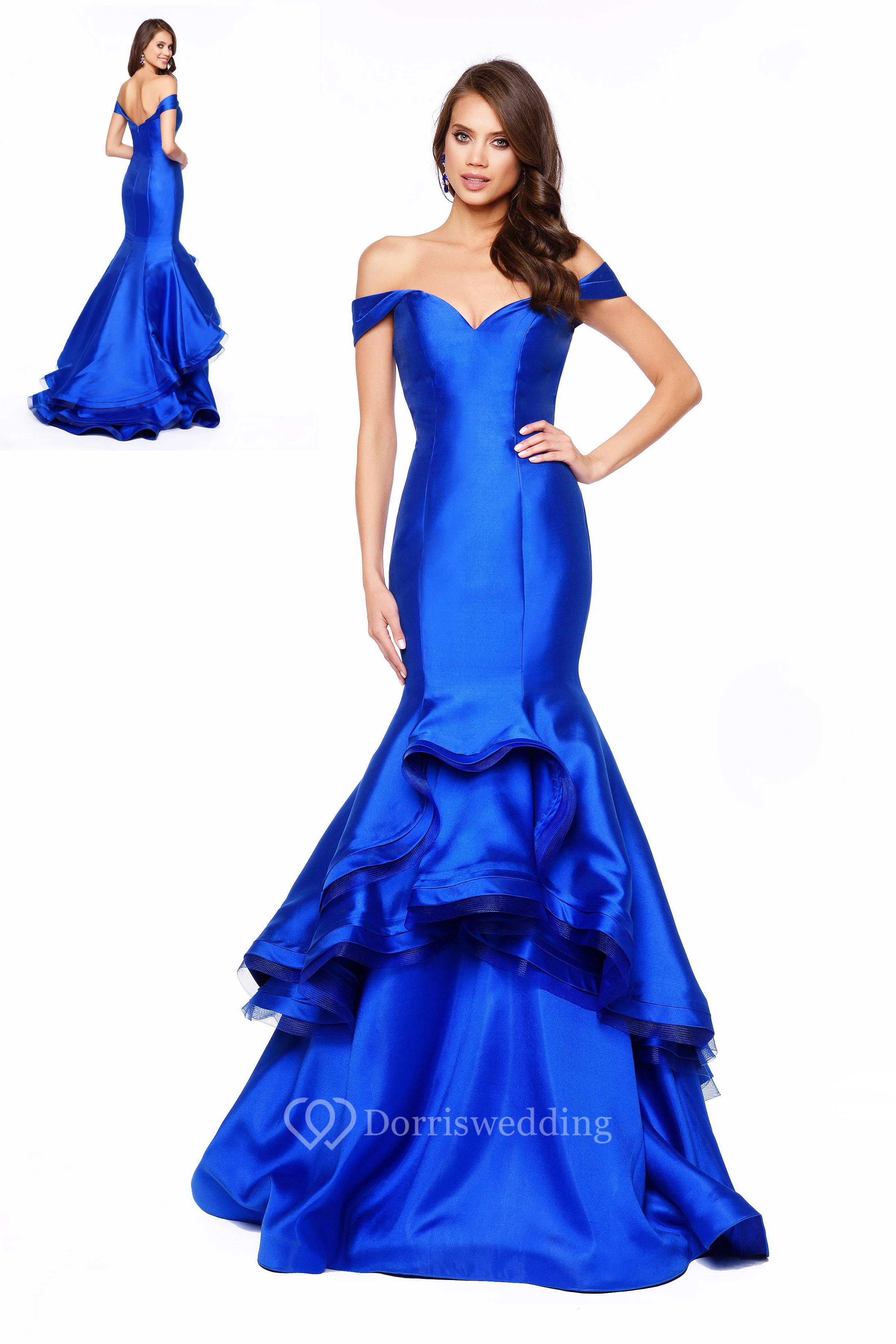 Mermaid Floor-Length Off-The-Shoulder Satin Low-V Back Dress With Tiers