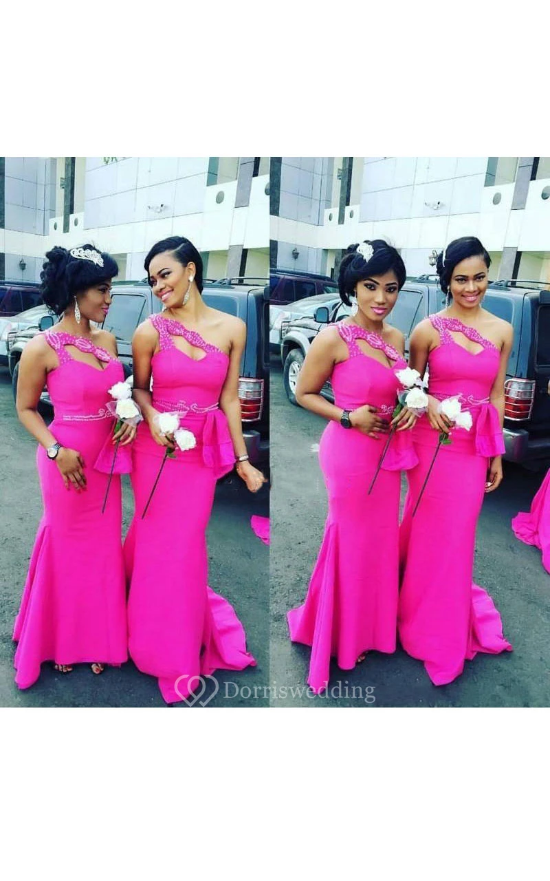 Mermaid Floor-length One-shoulder Scalloped Sleeveless Keyhole Sequins Satin Dress