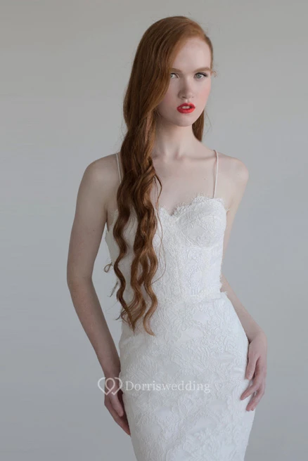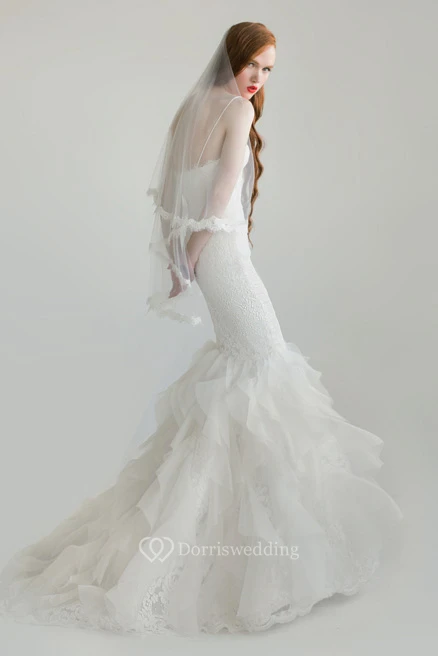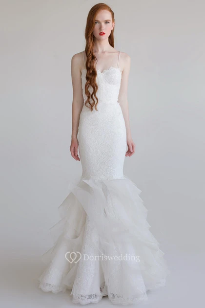 Mermaid Floor-Length Pick-Up Sleeveless Spaghetti Lace&Tulle Wedding Dress With Ruffles