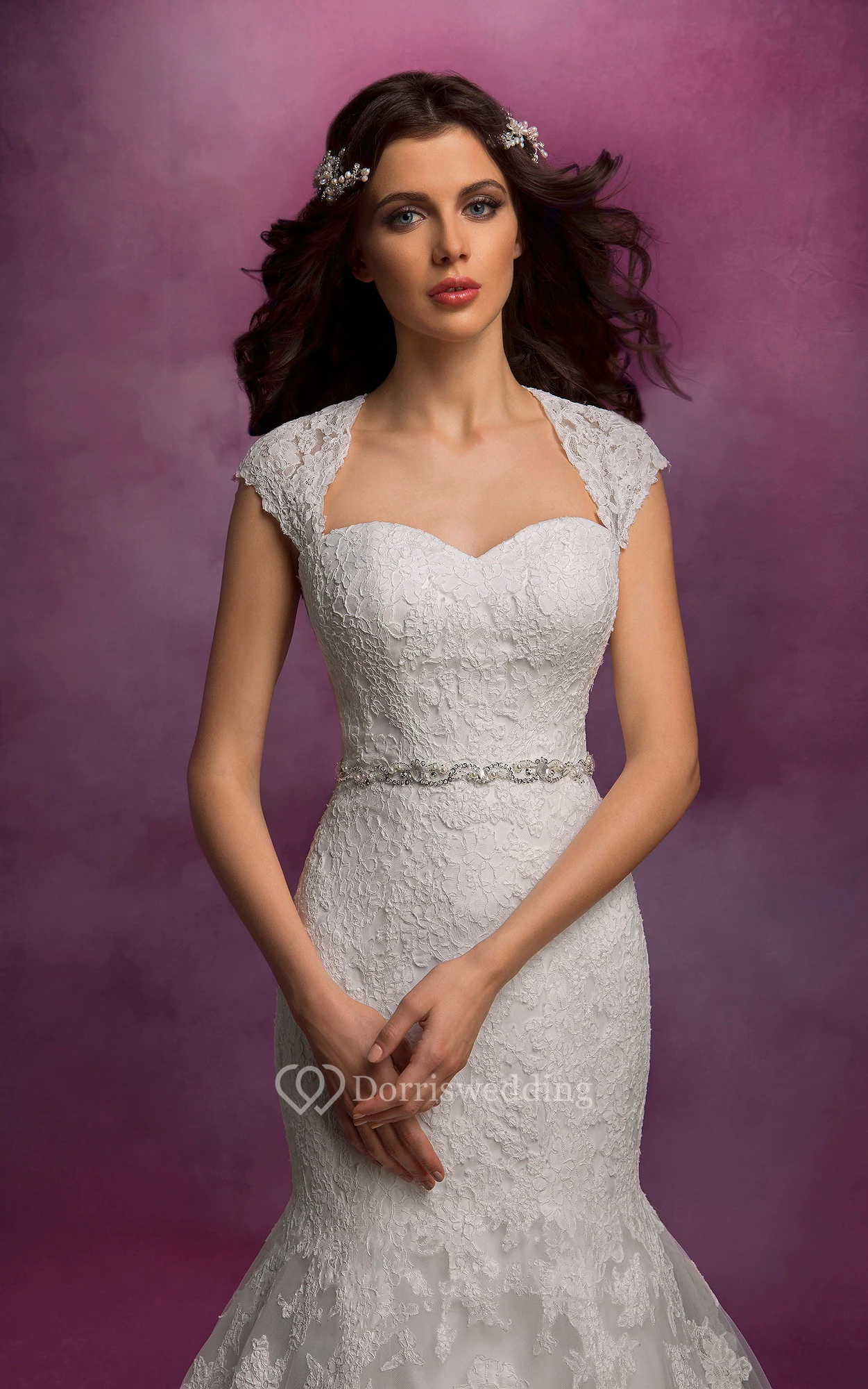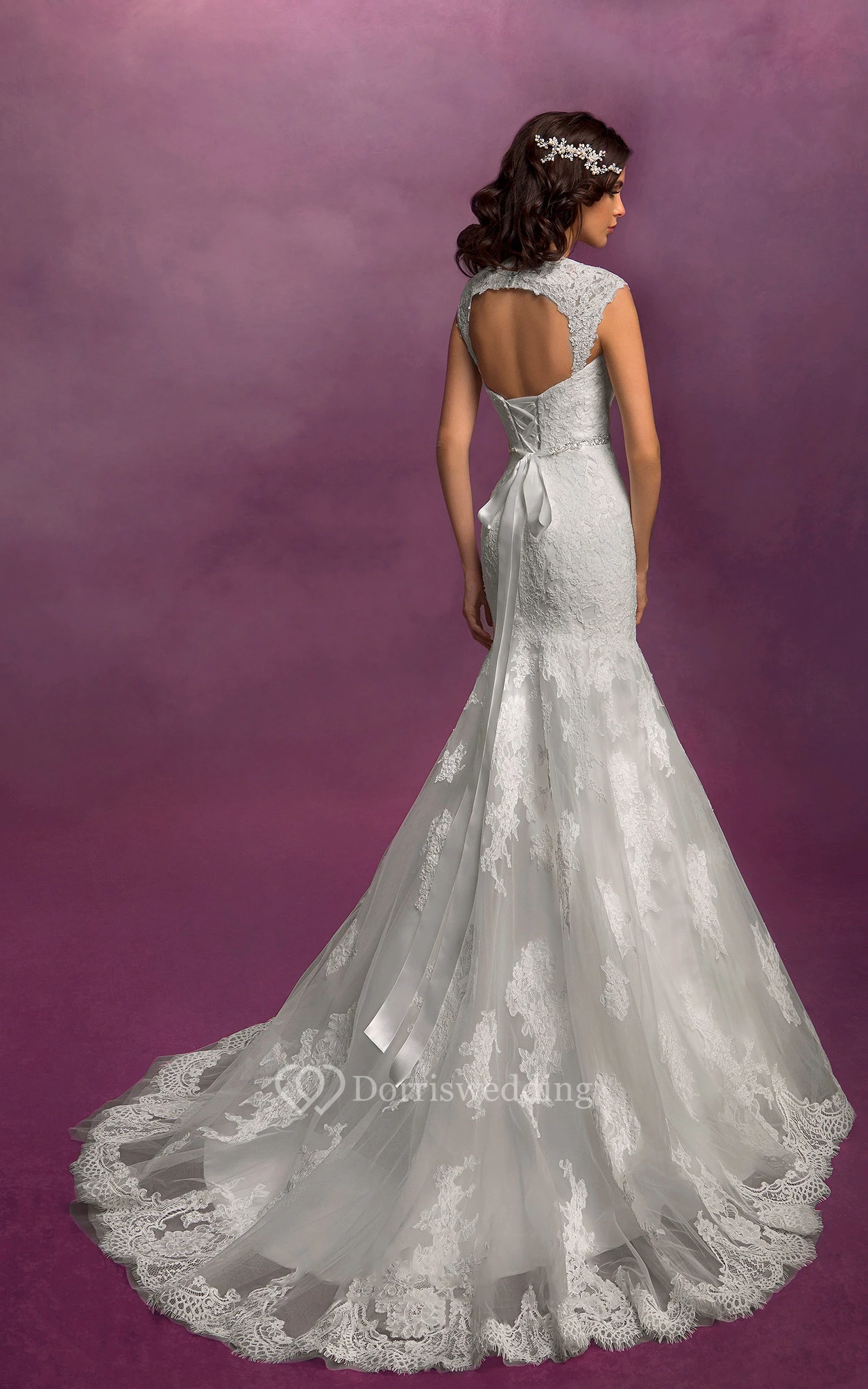 Mermaid Floor-Length Queen-Anne Keyhole Lace Dress With Appliques And Waist Jewellery