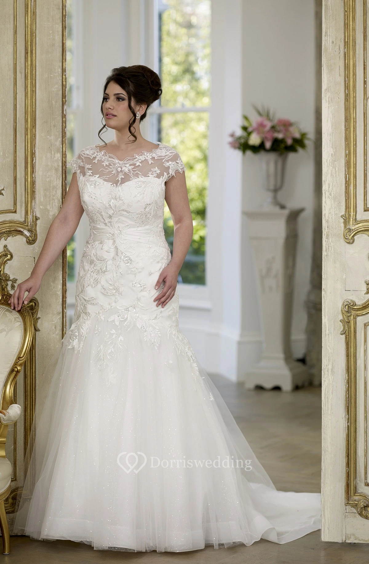 Mermaid Floor-Length Scoop Neck Short Sleeve Tulle Court Train Lace-Up Back Embroidery Bride Dress