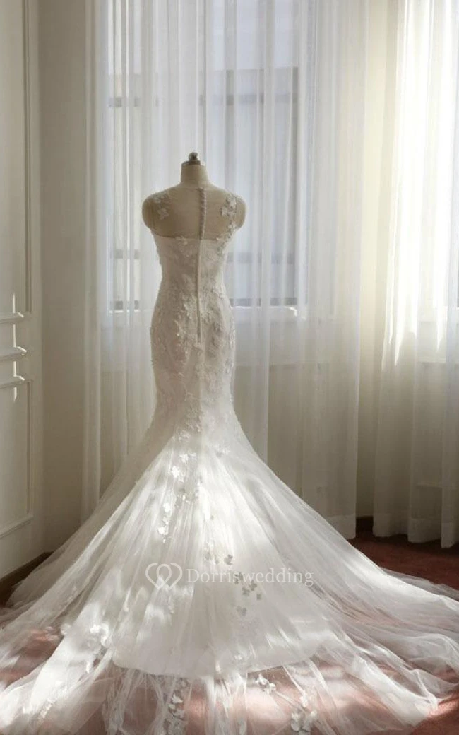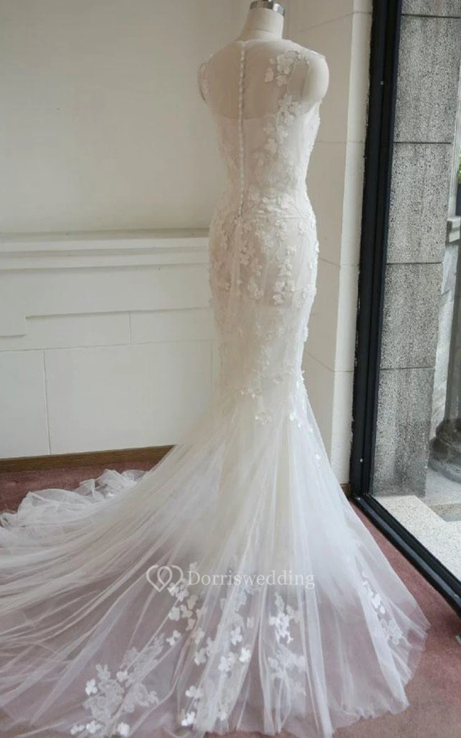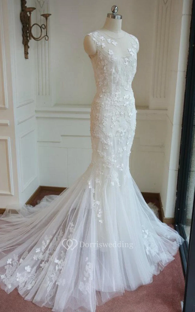 Mermaid Floor-Length Sleeveless Bell Appliques Button Zipper Keyhole Tulle Lace Dress