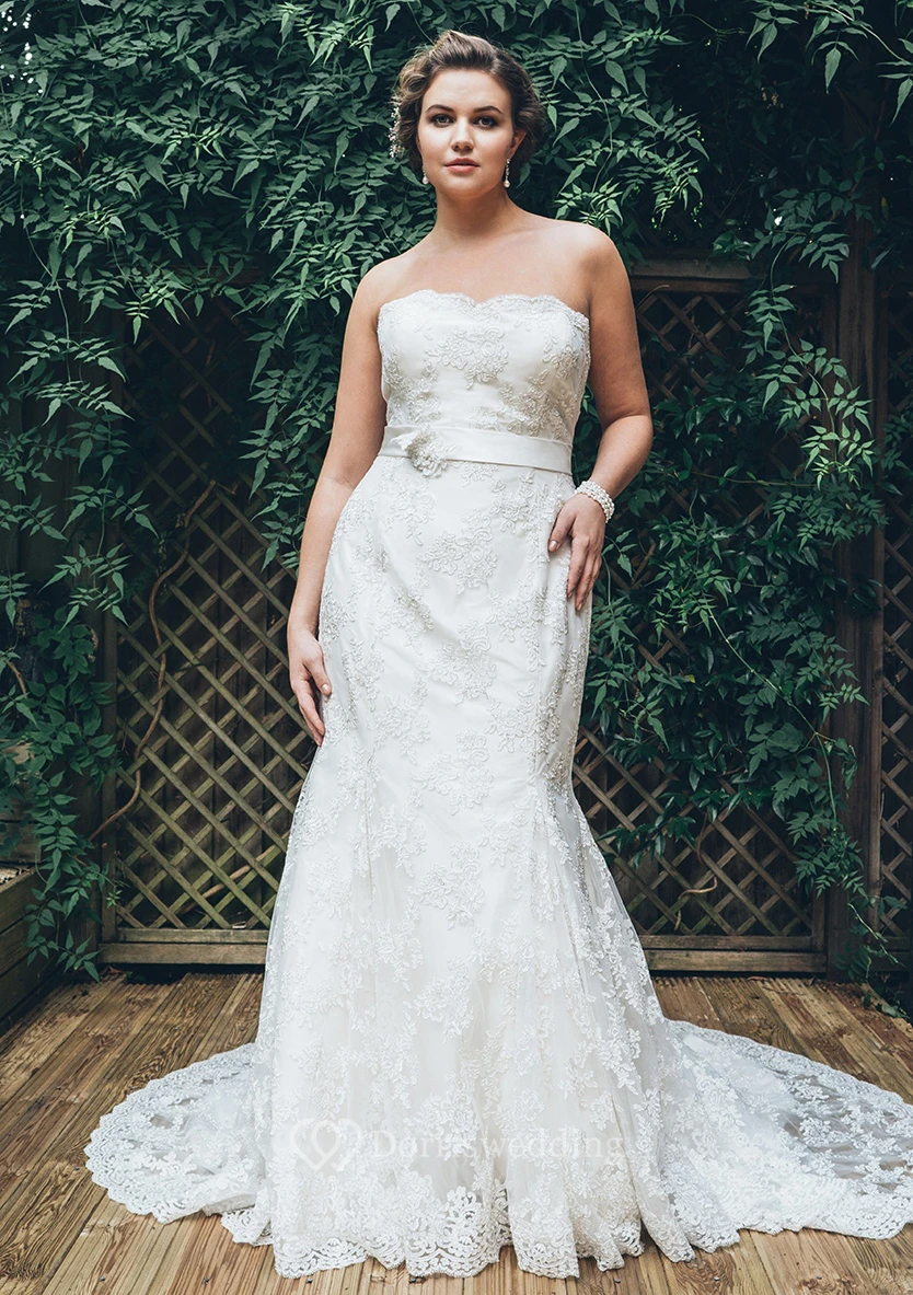 Mermaid Floor-Length Strapless Sleeveless Lace Flower Pleats Court Train Flower Dress