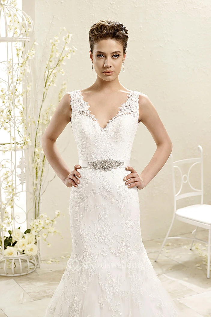 Mermaid Floor-Length V-Neck Appliqued Sleeveless Lace Wedding Dress With Waist Jewellery