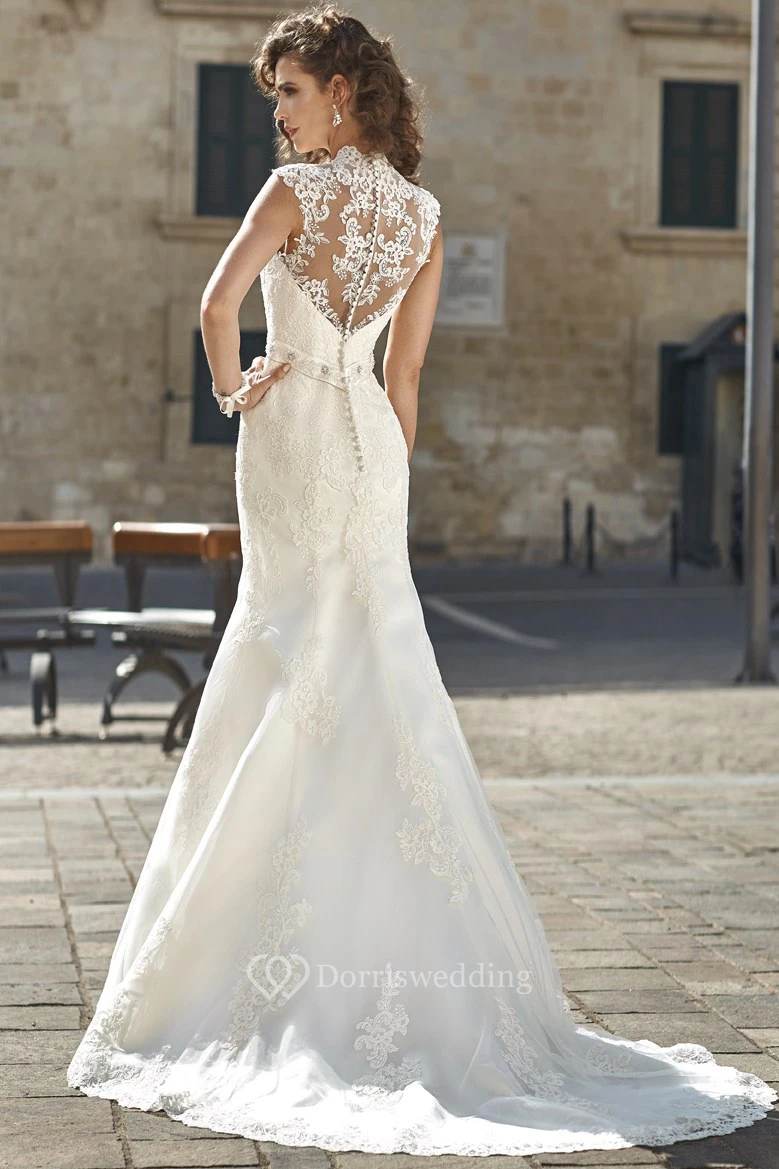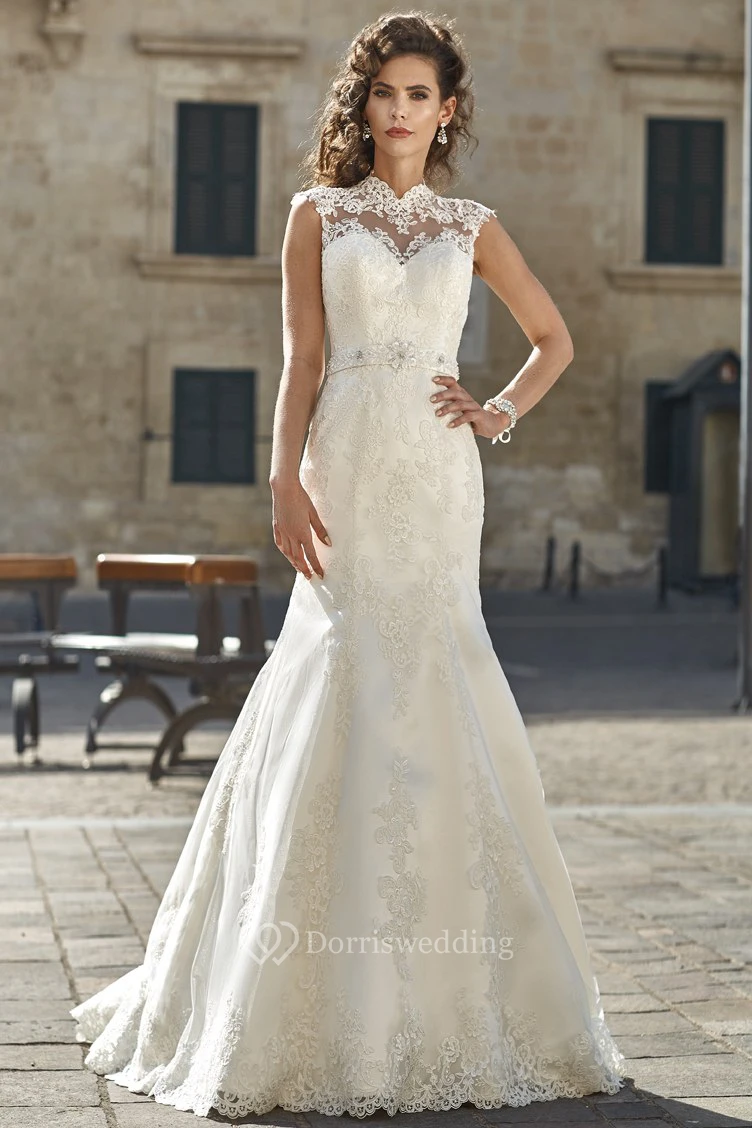 Mermaid High-Neck Sleeveless Appliqued Floor-Length Lace Wedding Dress With Waist Jewellery
