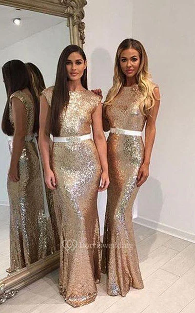 Mermaid Jewel Sleeveless Bell Cap Pleats Brush Train Backless Sequins Dress