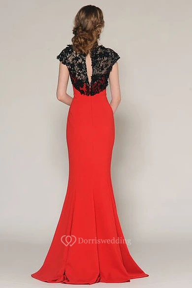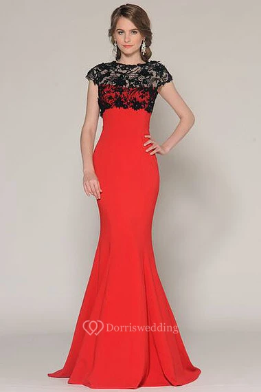 Mermaid Lace Cap-Sleeve Jewel-Neck Floor-Length Jersey Prom Dress