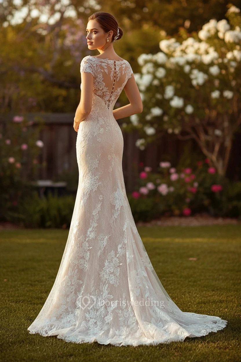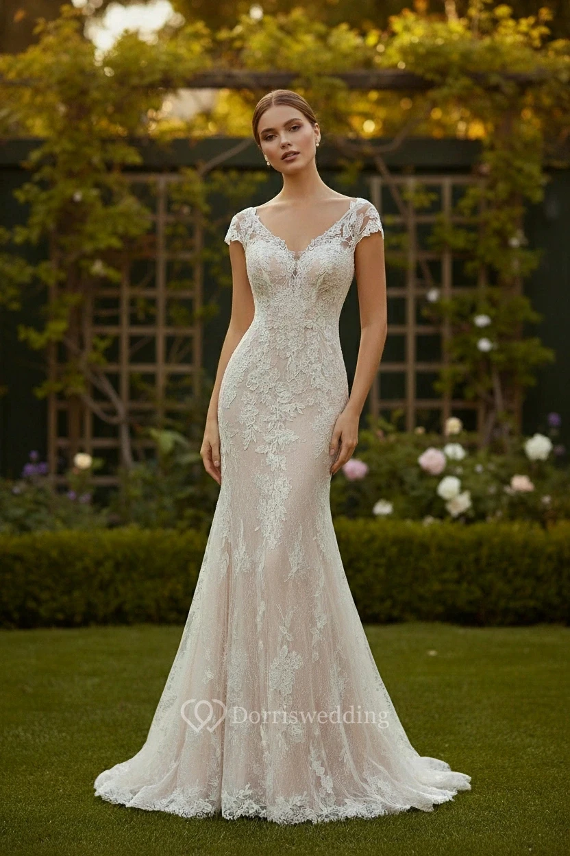Mermaid Lace Cap Wedding Dress with V-Neck and Short Sleeves