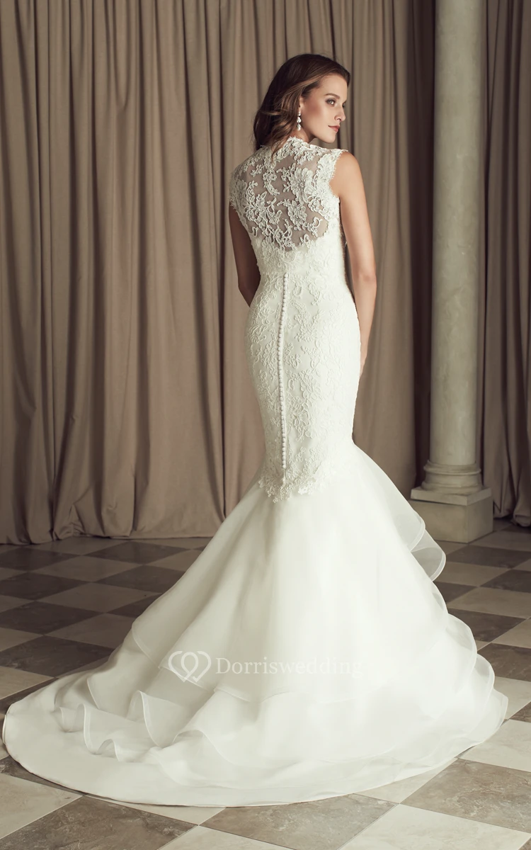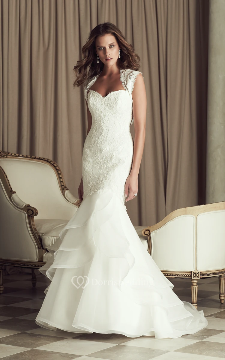Mermaid Long Cap-Sleeved Dress With Queen Anne Neckline