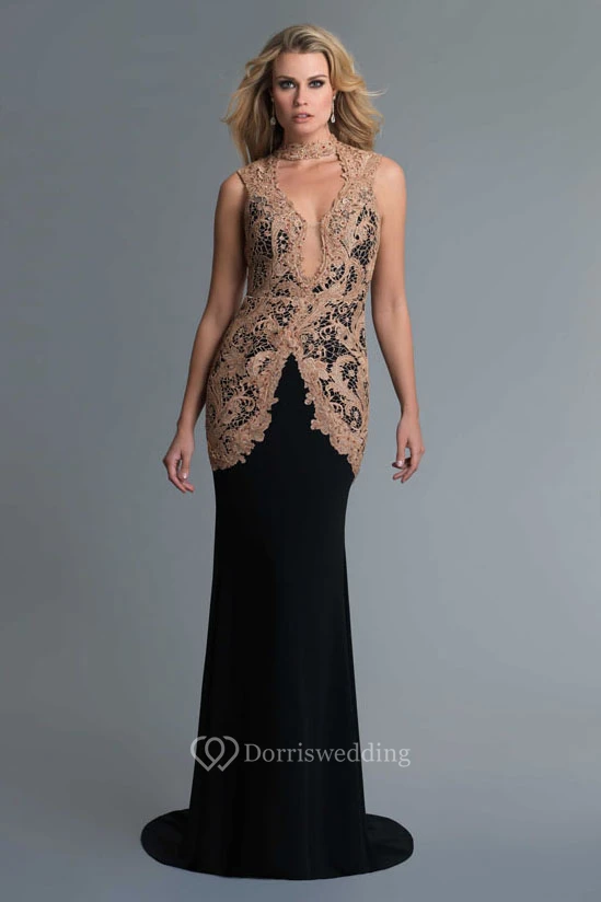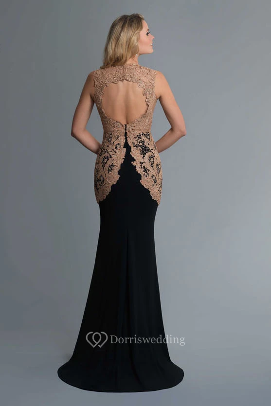 Mermaid Long High Neck Sleeveless Jersey Keyhole Dress With Lace