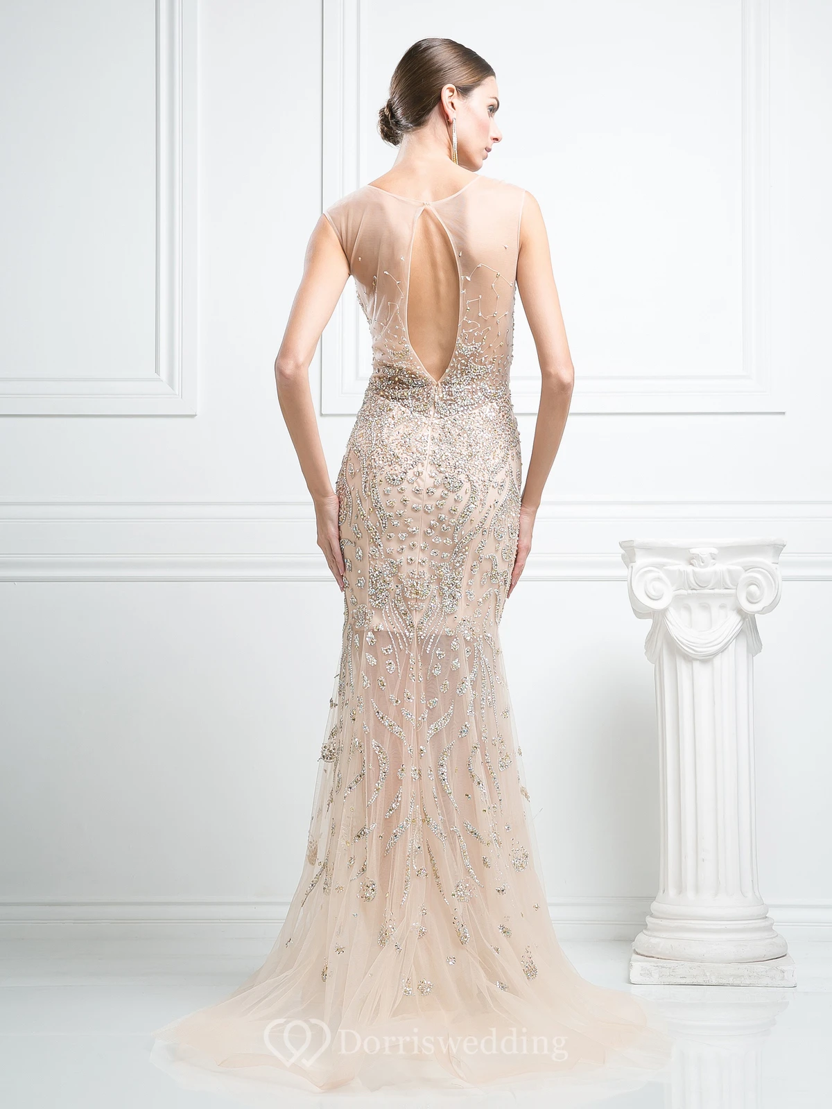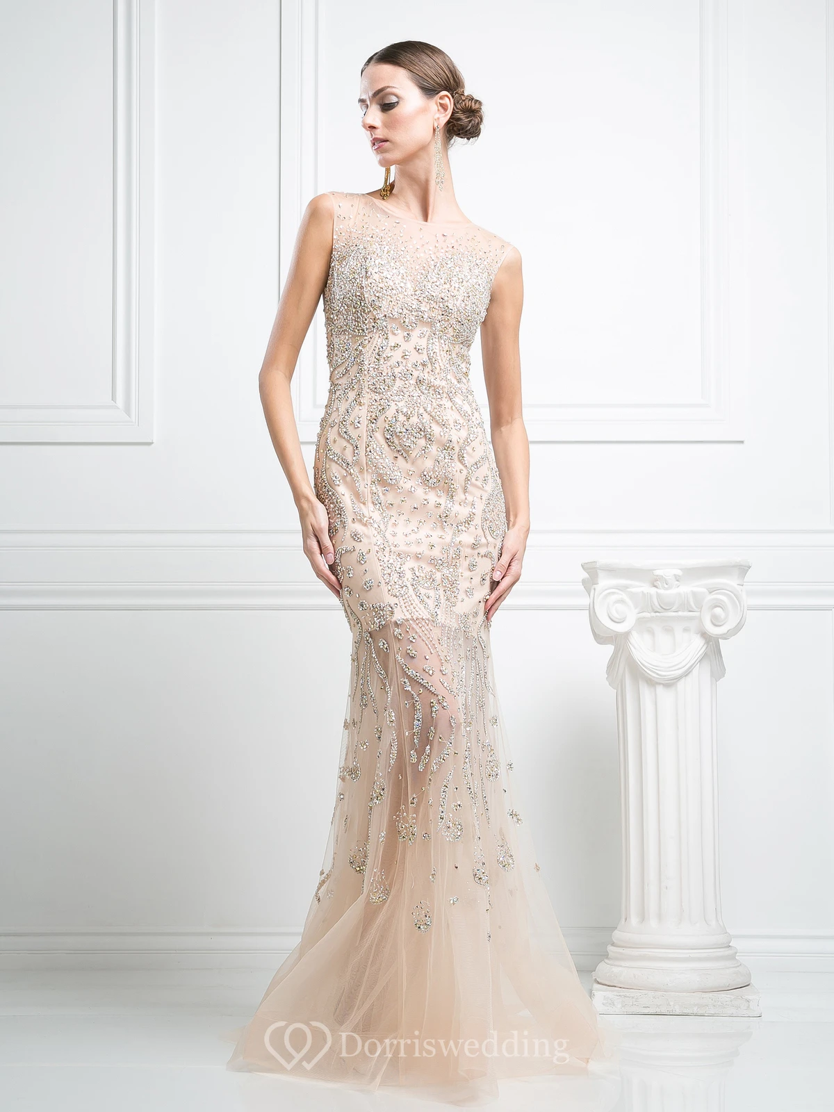 Mermaid Long Jewel-Neck Sleeveless Tulle Illusion Dress With Crystal Detailing