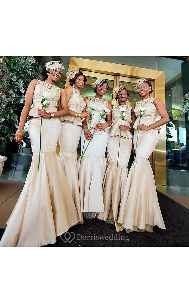 Mermaid Long Jewel Sleeveless Bell Peplum Zipper Lace Satin Dress