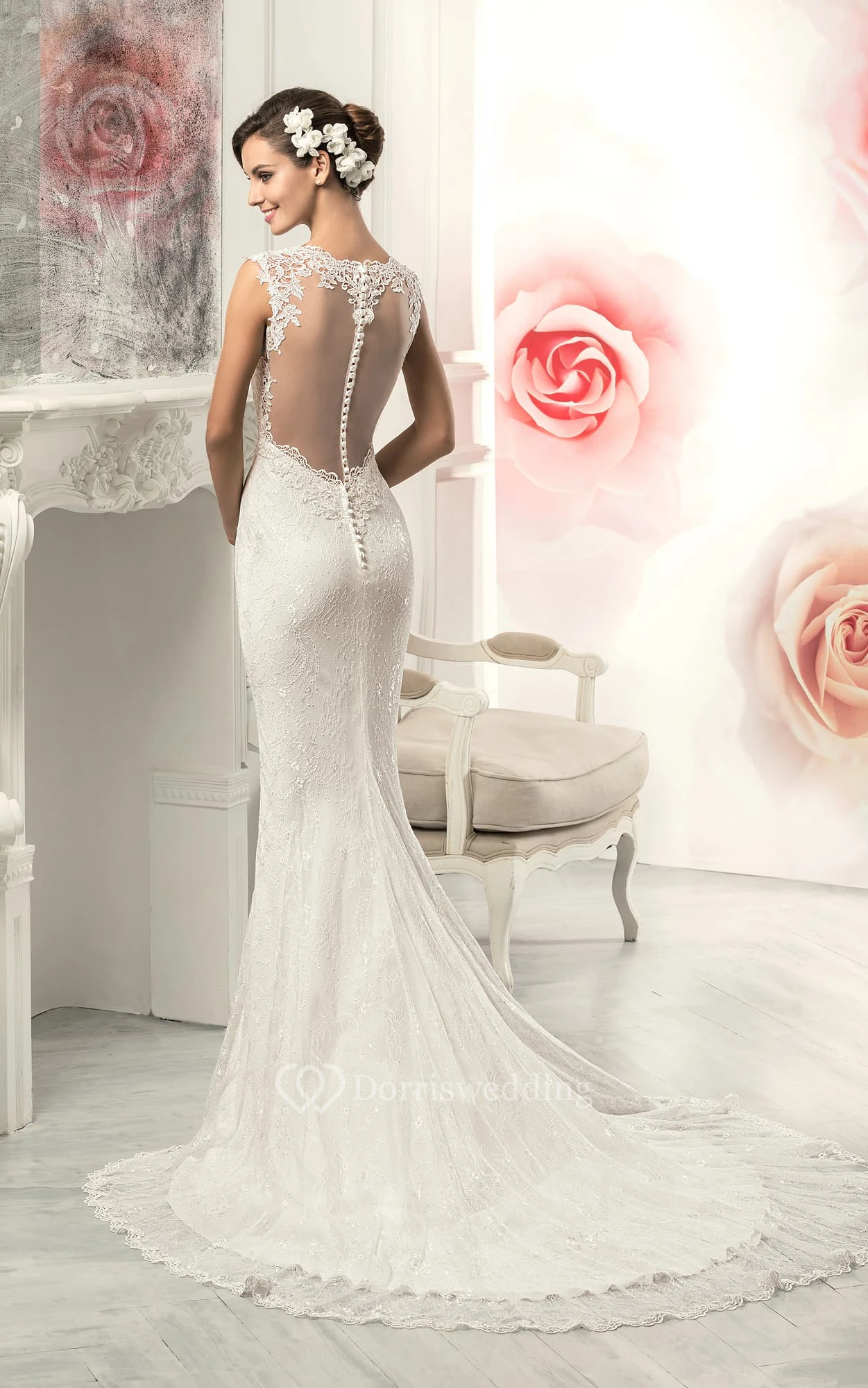 Mermaid Long Jewel Sleeveless Illusion Lace Dress With Appliques And Pleats