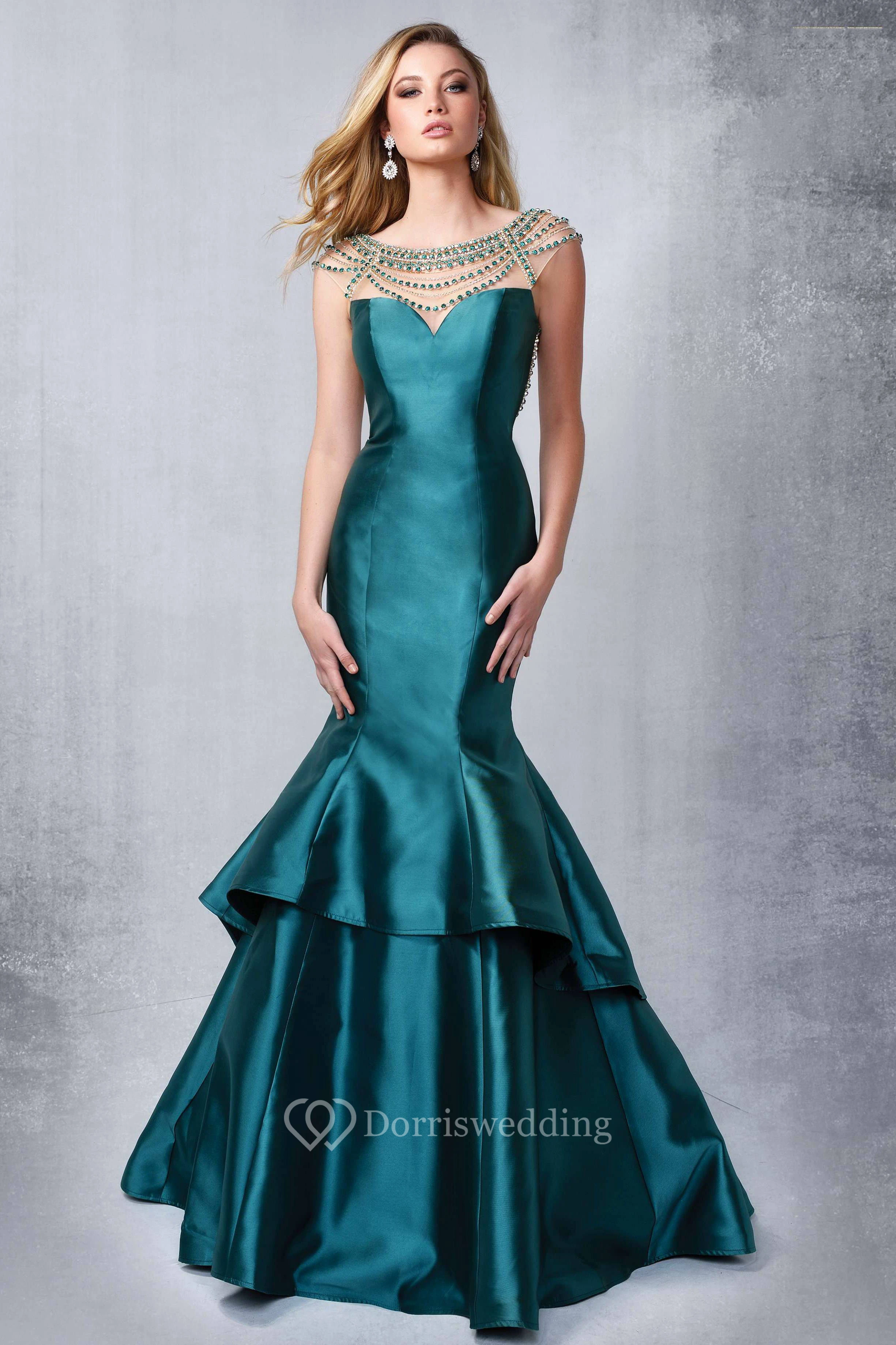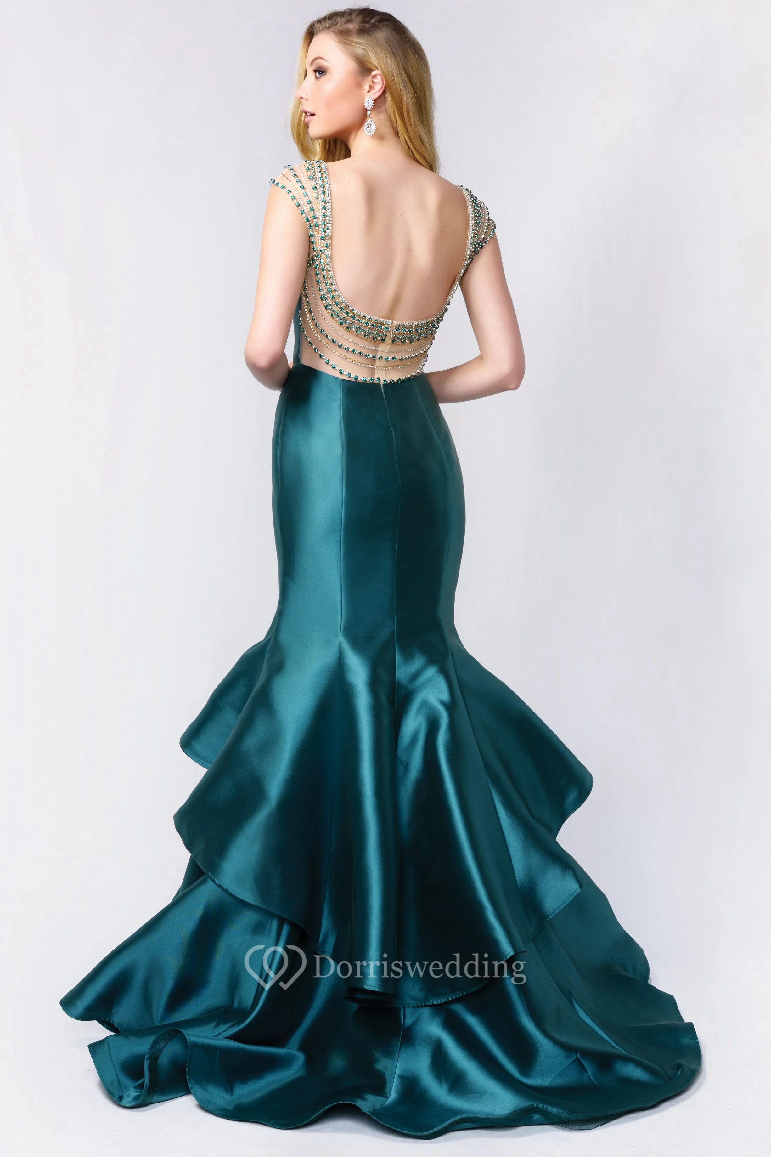 Mermaid Long Scoop-Neck Cap-Sleeve Satin Court Train Backless Dress With Beading And Tiers