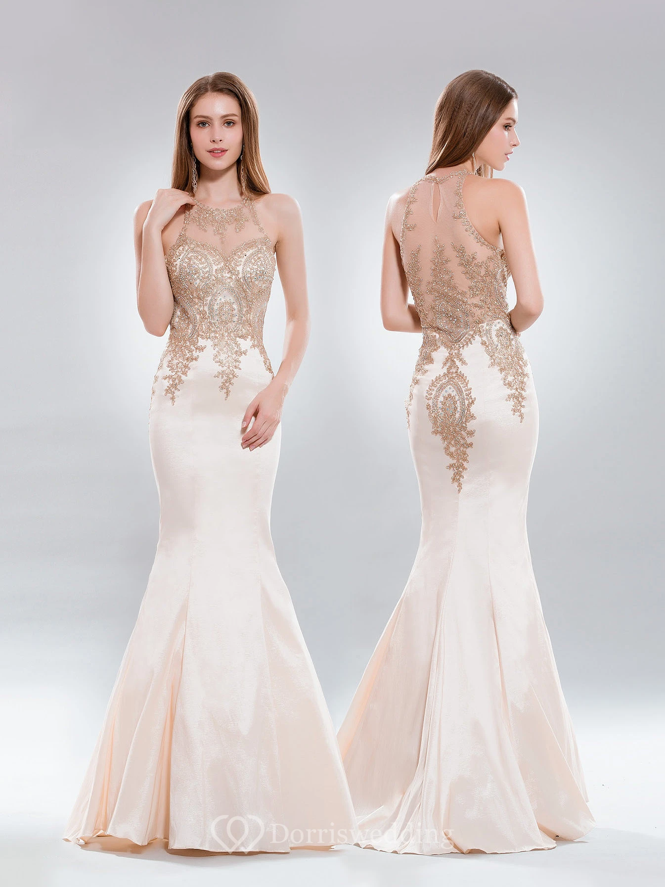 Mermaid Long Scoop-Neck Sleeveless Satin Illusion Dress With Appliques