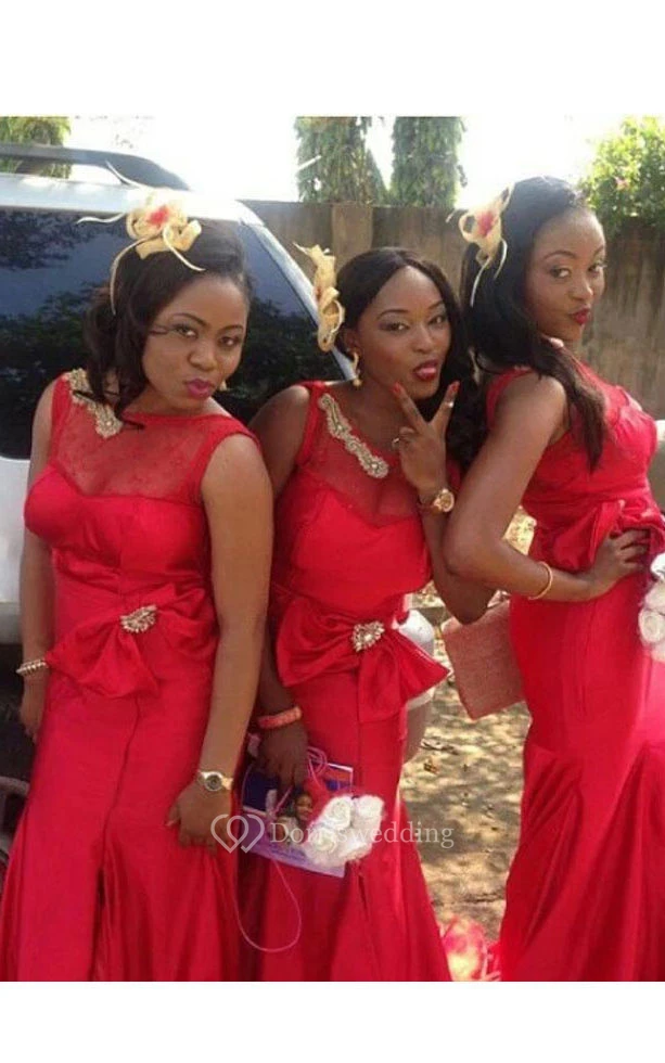 Mermaid Long Scoop Sleeveless Cap Draping Bow Beading Sequins Satin Dress
