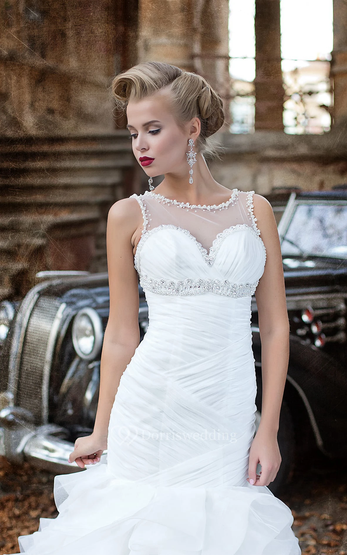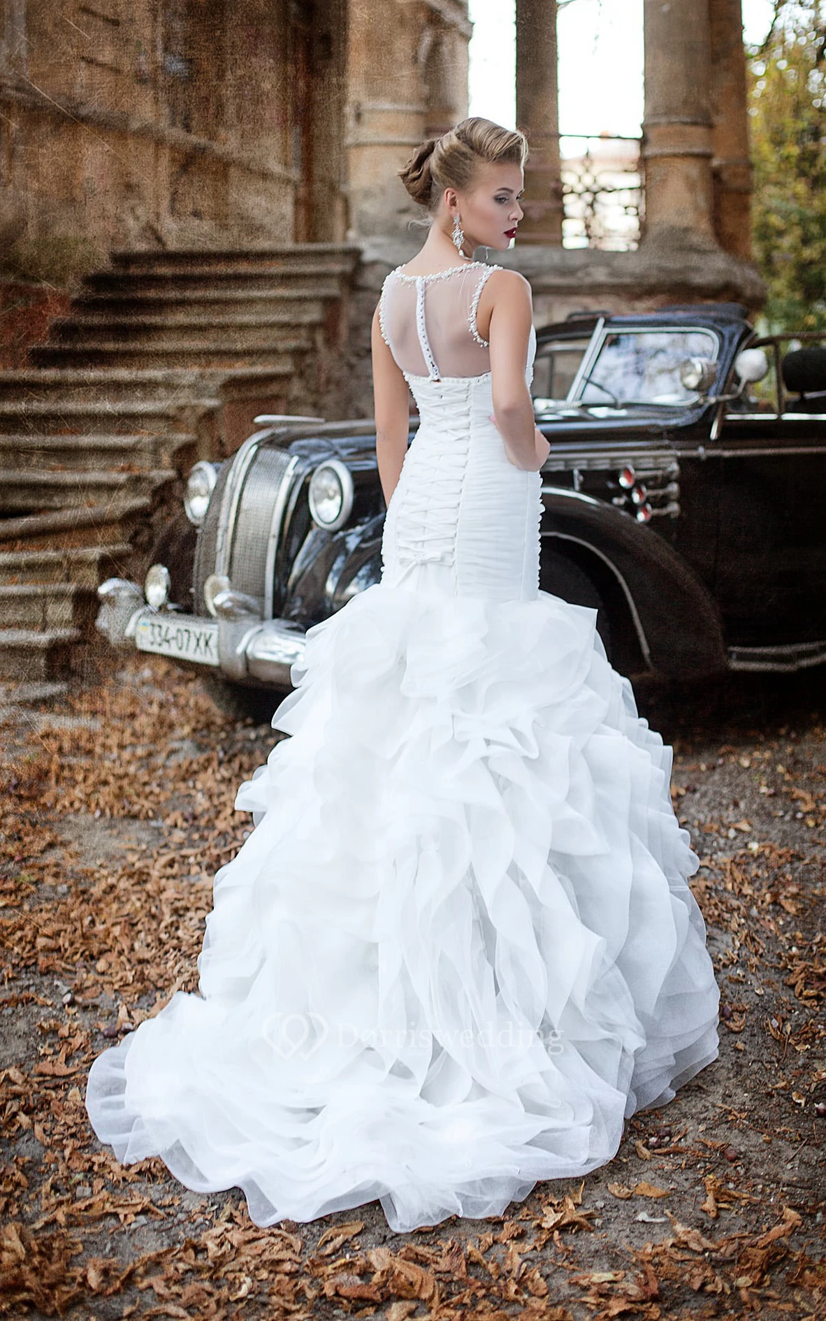 Mermaid Long Scoop Sleeveless Illusion Organza Dress With Beading And Ruffles