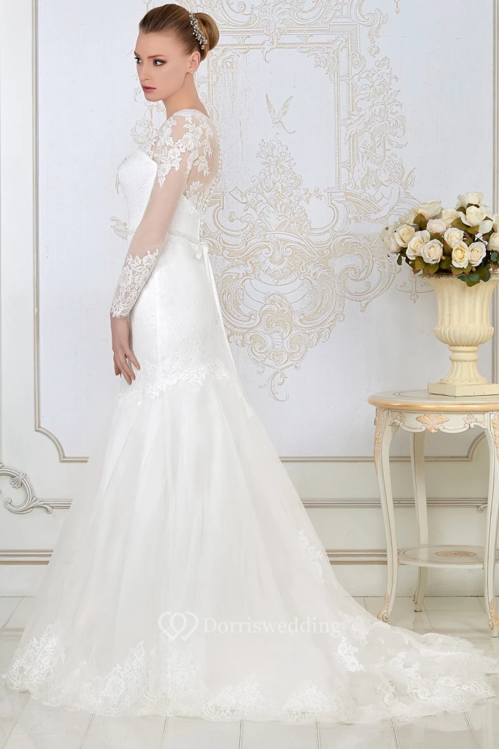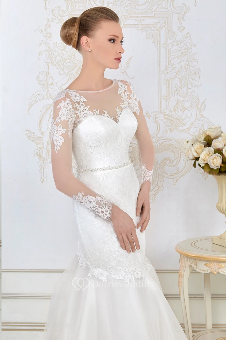 Mermaid Long-Sleeve Jewel-Neck Appliqued Floor-Length Lace&Satin Wedding Dress With Waist Jewellery