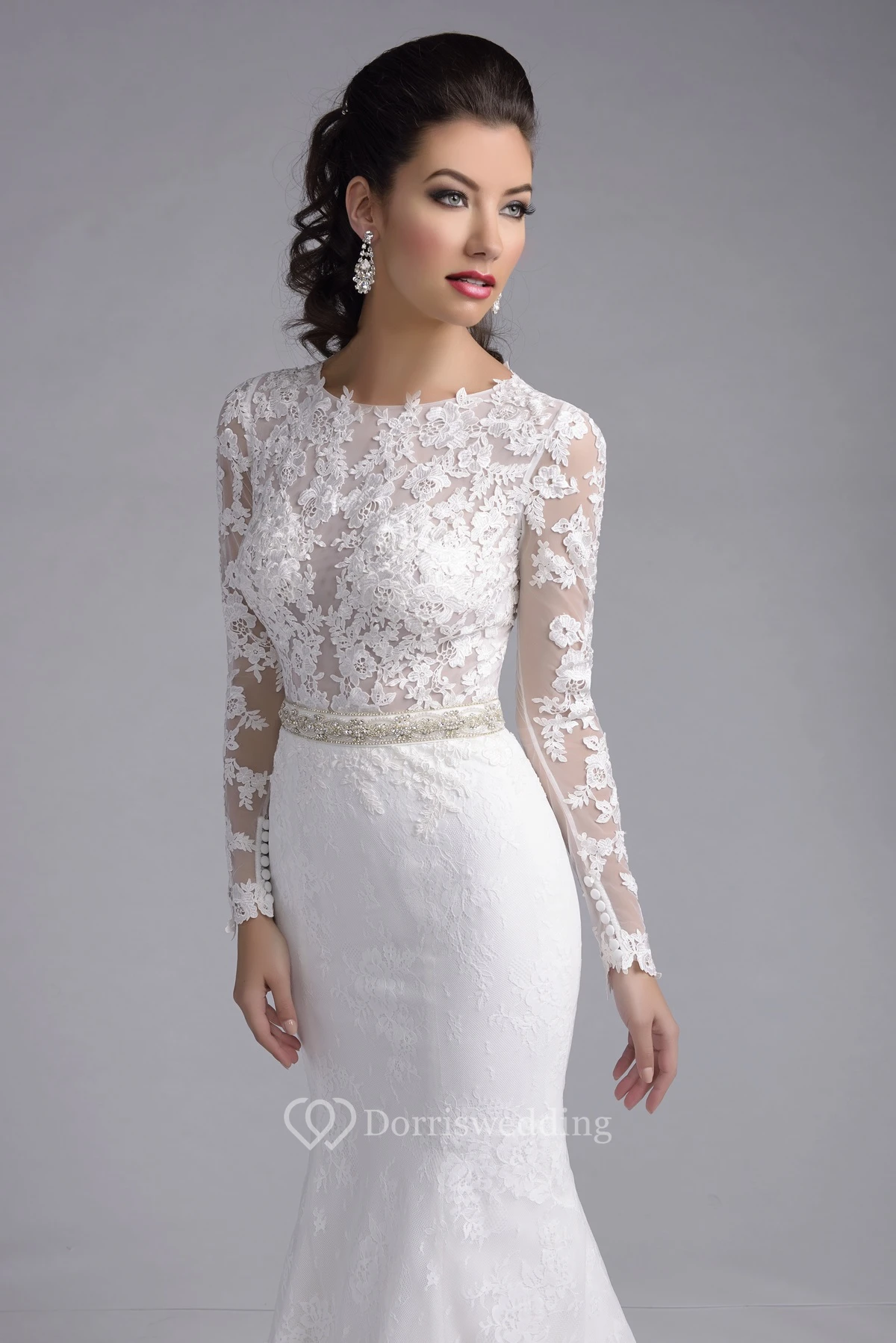 Mermaid Long Sleeve Lace Bateau Neck Wedding Dress Featuring Shimmering Detailing