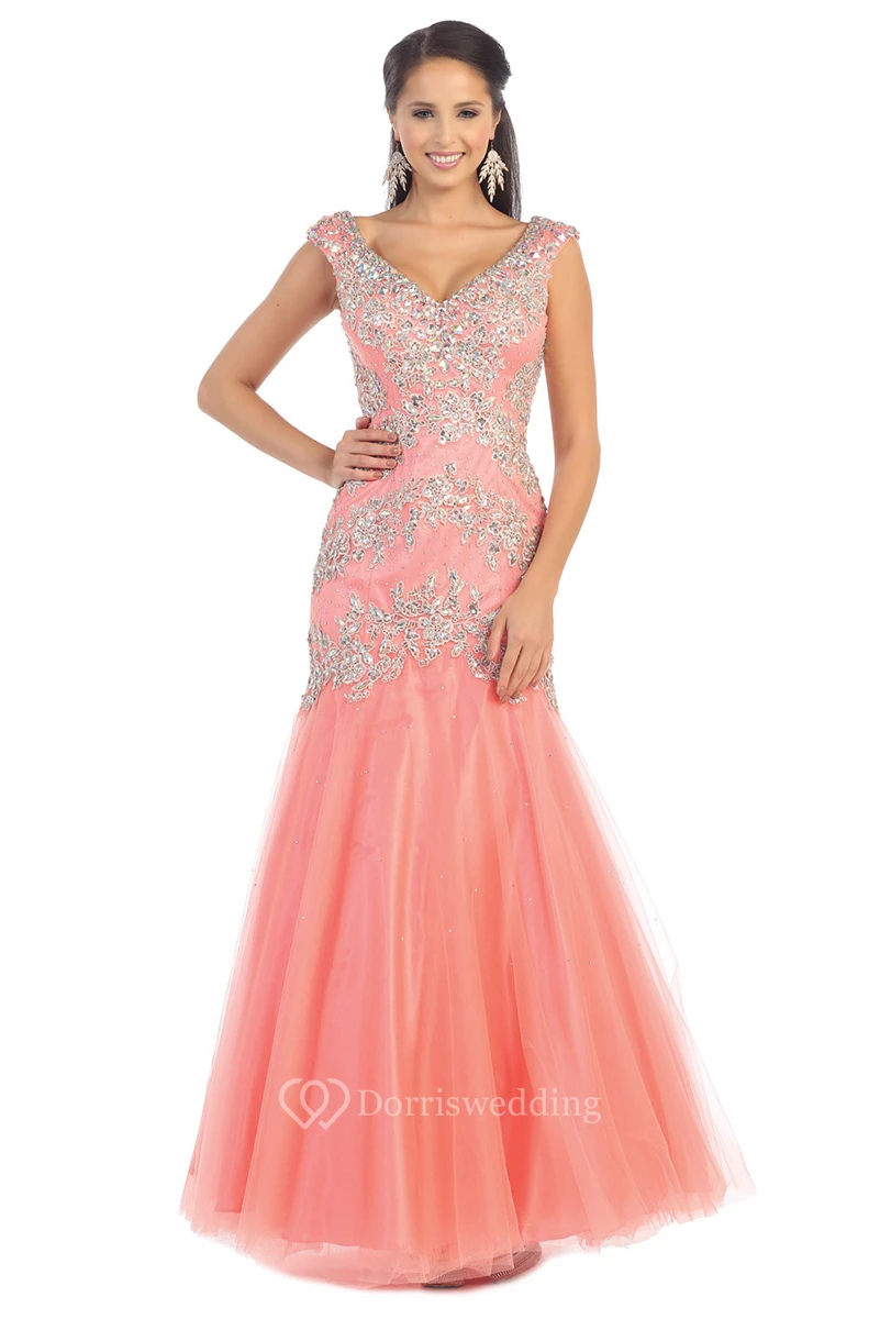 Mermaid Long V-Neck Tulle Low-V Back Dress With Beading And Pleats